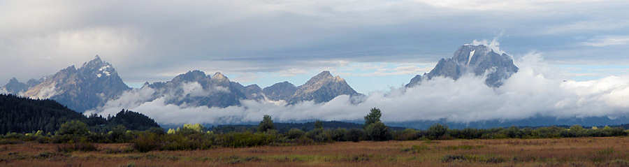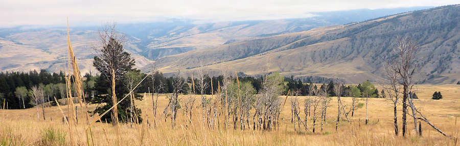 03.September 2015: Die Wecker sind heute überflüssig, denn eine Gewitterfront liegt über uns. Wir rätseln, ob es sich bei dem Gewitter um die verspätete 20% Regenwahrscheinlichkeit von gestern Abend handelt oder ob es die verfrühte prognostizierte 20%ige Regenwahrscheinlichkeit von heute Abend sein könnte. Es kracht mächtig und etwas missmutig stehen wir auf. Bei dem Wetter haben wir keine Lust zum Wandern. Zwar hört es auf zu regnen, doch gigantisch große und massiv wirkende Wolken liegen über uns. Dennoch ziehen wir unser "Wander-Kostüm" an, gehen frühstücken und fahren los in Richtung Canyon und Tower Fall. Während unserer letzten Besuche des Yellowstones in 2013 und 2014 sowie auch gestern konnten wir morgens gegen 7 Uhr eine traumhaft anmutende, idyllische Morgenstimmung erleben. Dicht über den Flüssen und Seen waberten Nebelschwaden, hinter denen sich langsam die aufgehende Sonne durchzusetzen versuchte. Edgar Wallace hätte es nicht besser vermocht, eine solche Atmosphäre zu kreieren. Und heute? Nix ! Die Landschaft schaut eher trostlos und verregnet aus und keinerlei Nebel ist über den Gewässern zu entdecken. Wir rätseln über die physikalischen Grundlagen, weshalb es keinen Nebel gibt, wenn es vorab geregnet hat. Der Nebel im Herbst entsteht ja nach unserer Meinung, wenn das Wasser wärmer als die darüber liegende Luftschicht ist. Hat der Regen also das Wasser abgekühlt oder das der Regen den Nebel gebunden? Egal! Auf jeden Fall sieht es heute nicht danach aus, dass die Akkus der Kameras mehrmals aufgeladen werden müssen. Wir entscheiden und nun definitiv gegen das Wandern und machen nichts anderes, als einmal durch den kompletten Park zu fahren und an der einen oder anderen Stelle anzuhalten.