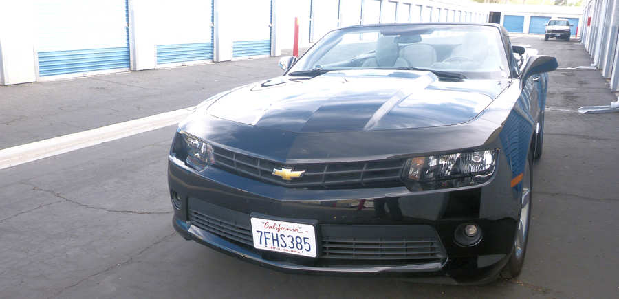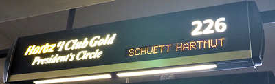 Wir starten pünktlich und das ist -wie wir heute Abend noch erfahren werden- vielleicht ein Glücksfall. Denn heute Abend wird uns mein Bruder noch einen Online-Artikel zusenden, wonach unsere "Gegenmaschine" (also die Linie Las Vegas => Frankfurt) am Freitag in Denver zwischenlanden musste und mit 32 Stunden in Frankfurt gelandet ist. Wenn ich mich jetzt nicht verrechne, war genau diese Maschine, in der wir jetzt sitzen, betroffen: Eine Mittdreißigerin hatte ihre Katze mit an Bord geschmuggelt, die ist dann ausgebüxt und durch die Maschine geirrt ist. Daraufhin ist die Katzenhalterin gegenüber einer Flugbegleiterin handgreiflich geworden, wollte gewaltsam in das Cockpit und drohte, aufgrund ihrer Kontakte zur Mafia die Maschine zum Absturz zu bringen, worauf die Maschine von zwei aufgestiegenen F16-Kampfjets begleitet in Dallas zwischenlanden musste. Doch davon wissen wir ja jetzt noch gar nichts. Der Service ist gewohnt freundlich und aufmerksam und die Speisen können sich mittlerweile mit einem guten Restaurant messen: Neben Pasta oder alternativ Rindfleisch gibt es als Starter Salat mit Lachs und marinierte Krabben. Und die Sitzplätze bieten ebenfalls ausreichenden Komfort und vor allem Platz! Gegen 15Uhr Ortszeit landen wir pünktlich und wie vom Piloten vorhergesagt etwas ruppig, weil über Vegas Gewitter und starker Wind herrschen. Dafür war die eingeschlagene Route gut gewählt: Unter uns konnten wir den Bryce Canyon, den Zion und den Hoover Dam entdecken. Wer vorne sitzt kommt in den Genuss, schnell draußen zu sein und daher stehen wir bei der Imigration auch ziemlich weit vorne in der Schlange. Das Prozedere geht recht zügig, da sich die Schlange in Grenzen hält. Hier haben wir schon ganz anderes erleben müssen. Vorbei an den Gepäckbändern gehen wir zum Zoll und der Schalterbeamte stutzt etwas, nachdem wir angeben drei Wochen zu bleiben und kein Gepäck dabei zu haben scheinen. Auf unsere Erklärung, dass wir in Vegas einen Storage haben gratuliert er uns zu einer solch guten Entscheidung. Einfach nett ! Per Email erfahren wir, dass uns bei Hertz auf dem Parkplatz Nr. 226 (im Englischen "Stall") ein schwarzer Camaro erwarten wird. Prima, wir werden uns daher ein mögliches Upgrade auf diesen Wagentypen sparen können. Wir buchen meist die Standard-Cabrio Klasse und wählen dann, wenn uns der Wagen nicht gefällt, ein Upgrade. Bisher hatten wir oft Glück und erhielten durch unsere Mitgliedschaft einen Wagen der größeren Klasse.
