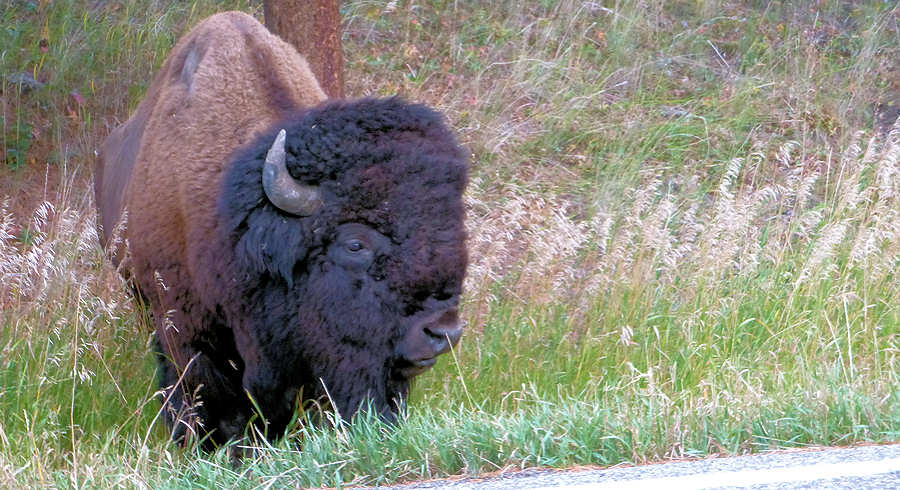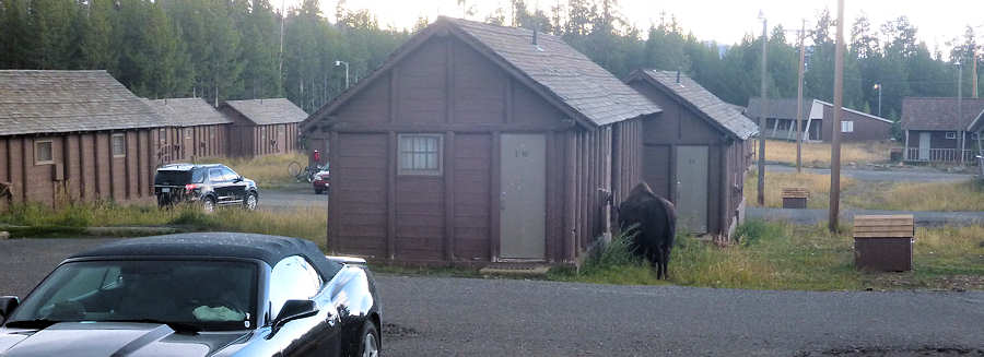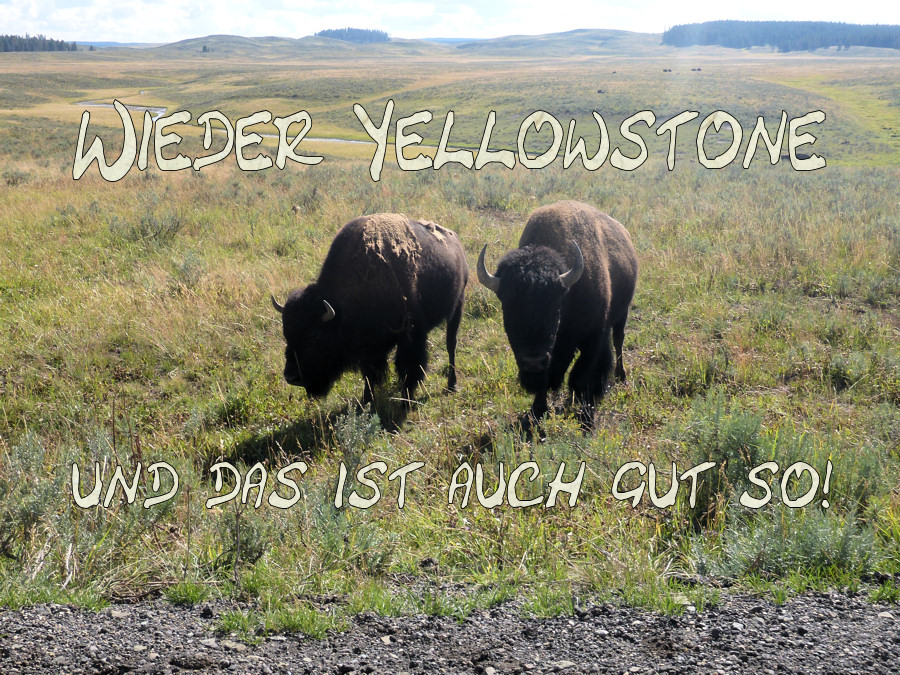Auf der weiteren Fahrt durch den Park kommt es uns wieder über die Lippen: "Wieder alles richtig gemacht!" Denn das Wetter nördlich vom Canyon Village ist ziemlich schlecht. Dicke dunkle Wolken liegen über Mount Washborn und das ist genau der Trail, den wir heute gemacht hätten, wenn wir nicht den für gestern vorgesehenen Trail nach hinten verschoben hätten. Langsam geht es in Richtung Cabin, die natürlich wieder nicht fertig ist. Also drehen wir nochmal eine Runde zum See und schlendern durch den General Store. Während wir in den ersten Jahren stark kauforientiert durch das Land gezogen sind, immer mit der Idee im Kopf, jetzt könnte man das ideale, einmalige und so was von originellem Mitbringsel erstehen, haben sich bei uns -wie bereits mehrmals erwähnt- die Kauf-Hormone stark gelegt. Wir schlendern nach wie vor gerne durch diese Läden, amüsieren uns über den einen oder anderen Artikel, aber meist verlassen wir die Läden mit den selben Sachen: einen Kaffee oder eine Soda. Wieder zurück an der Cabin stellen wir zufrieden fest, dass sie gesäubert ist. Wir machen uns ein wenig ausgehfertig und dann ins Cafe zum Abendessen und siehe da, es gibt wieder die Coconut-Chicken. Zurück in der Cabin gehen wir unseren üblichen Tätigkeiten nach. Während ich diese Zeilen in die Tastatur hacke räumt Anita den Wagen für unsre morgige Weiterfahrt ein. Um irgendwelchen sexistischen Vorwürfen entgegen zu treten: Anita macht es in der Tat Spaß, das Auto zu beladen und in einem stets aufgeräumten Zustand zu setzen. Tatsache ist, dass immer alles griffbereit ist. Ich darf dabei allenfalls das Gepäck raustragen, aber auch das wird mir manchmal verwehrt :-) Und während ich vor mich hertippe merke ich schwere Schritte an der Wand unserer Cabin. Zwar wackelt die Oberfläche meines Kaffees nicht wie einst das Wasserglas in Jurassic Park, dennoch ist mir klar, dass das Stampfen nicht menschlichen Ursprungs ist. Und tatsächlich sehe ich beim Blick aus dem Fenster den behaarten Rücken eines Bisons, der an unserer Veranda vorbei geht und bei der Nachbar-Cabin zu grasen beginnt. Sollten wir noch einmal in den Yellowstone kommen, dann bestehen wir auf eine Cabin mit Gras vor der Tür. Denn wir wollen unseren eigenen Bison im Vorgarten.