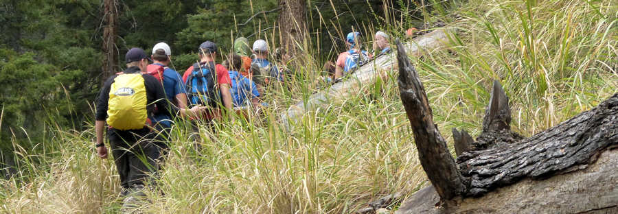 Zunächst erschrecken wir uns ein wenig, denn ein gutes Dutzend junger Hiker, durchschnittlich ein Drittel so alt wie wir (grob geschätzt) betritt mit uns den Trail. Nichts gegen Mit-Hiker aber wenn man es liebt, alleine zu Hiken, ist das leider sehr viel. Aber wir werden uns sicherlich arrangieren. Außerdem hegen wir die Hoffnung, dass so junge Hiker vor Kraft strotzen und uns schon in der ersten Kurve abhängen. Bis zum ersten und einzigen Abzweiger ist es etwa 1,2 Kilometer und die haben es in sich. Der Weg, der zunächst durch den Wald führt, geht sehr steil bergauf, und zu unserem Erstaunen keucht und hechelt das Jungvolk nicht leiser als wir. Dennoch lassen wir die Jung-Hiker an uns vorbei ziehen, um an der bereits erwähnten Abzweigung wieder auf sie zu stoßen.