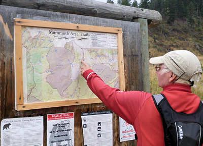 Ungelogen ein bis zwei Minuten bleibt es regungslos stehen bis es endlich weiter geht. Der Trail beginnt in unmittelbarer Nähe vom Liberty Cap beim Mammoth Hot Springs, einen bekannten und beliebten und damit stark frequentierten Hot Spot vom Yellowstone. Bekannt war uns dieser Ort u.a. durch Filmberichte über den Yellowstone, denn gelegentlich durchstreifen einzelne Hirsche den kleinen Ort. Und das kann jetzt zur Brunftzeit manchmal ungemütlich werden. Doch heute entdecken wir nur eine friedlich grasende Hirschkuh. Am Visitor-Center erkundigen wir uns nach den Wegkonditionen, aber unsere Rangerin ist sehr sparsam mit den Auskünften und zeigt uns nur, wo der Trailhead ist. Den kennen wir schon, bedanken uns aber recht freundlich und fahren mit dem Wagen zum Trailhead. Nun beginnt zwischen Anita und mir eine nicht endend wollende Diskussion, wo wir parken sollen. Wir stehen jetzt auf einem Parkplatz, der auch als Parkplatz für Besucher der Restrooms ausgewiesen wird. Anita ist davon überzeugt, dass nur Nutzer der Restrooms diesen Parkplatz nutzen dürfen. Ich hingegen vertrete die Meinung, dass mit dem Hinweis auf "Restrooms Parking" gemeint ist, dass derjenige, der zu den Restrooms möchte, hier parken kann. Aber eben nicht ausschließlich. Die Aufgabe des Mannes ist nachzugeben, wo Widerstand keinen Wert mehr hat und so bin ich damit einverstanden, auf der gegenüberliegenden Straßenseite zu parken. Ich verkneife mir den Sarkasmus die Frage aufzuwerfen, ob ich denn hier parken darf, wenn ich erst die Restrooms aufsuche und dann den Trail laufe ;-) Der Trailhead beginnt "um die Ecke" der Restrooms und soll im weiteren Verlauf als Loop zu den Beaver Ponds führen und dann hier in der Nähe wieder enden. Er ist mit 5 Meilen angegeben und wird an unterschiedlichen Stellen mal mit 8km und mal mit 8,3km Länge umgerechnet. Der Schwierigkeitsgrad soll von "moderate" bis "strengous" reichen. Da wir diesbezüglich schon die tollsten Sachen erlebt haben, werden wir uns mal überraschen lassen: So manch mit "strengous" gekennzeichneten Trail empfanden wir als "moderate" und genausoft das ganze auch umgekehrt.