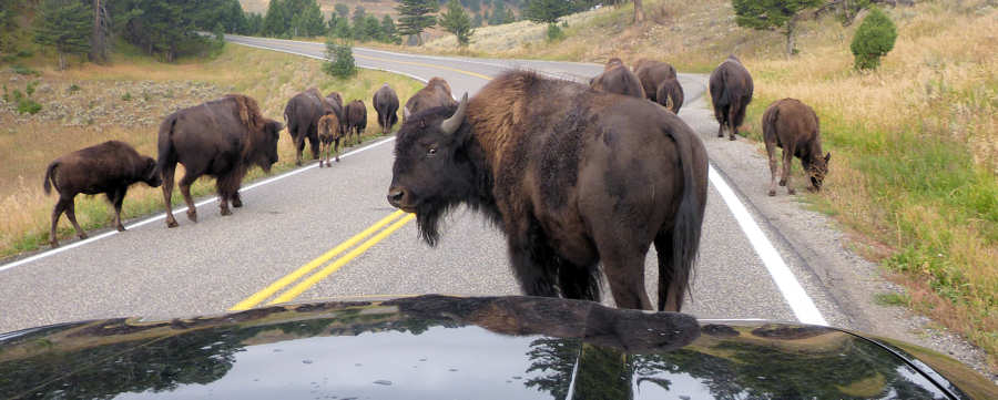 Anita macht einmal den Fehler und lässt eine zu große Lücke zu dem vorausfahrenden Fahrzeug und schon nutzen Bisons diese Lücke aus und setzen sich dazwischen, als hätten sie einen riesigen Spaß daran, Staus zu machen. Einem Bison fahren wir fast in die Hacken, weil es ohne Vorwarnung stehenbleibt und uns anschaut nach dem Motto: "Eyh, was geht denn jetzt hier ab?"