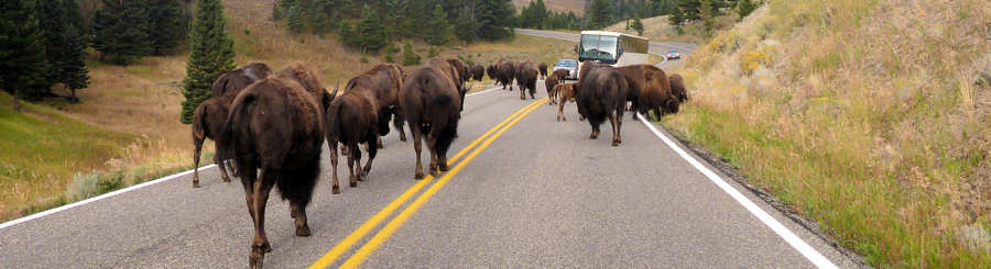 Wir planen für heute die Wanderung, die ursprünglich für gestern vorgesehen war. Wir wollten uns mit den Schwierigkeitsgraden der Hikes langsam steigern und hatten daher für gestern den Beaver Ponds Trail auf dem Programm, der es nun auf den heutigen Tag geschafft hat. Der Weg dorthin hat es in sich, knappe Termine im Yellowstone sind ein "no go". Denn hinter jeder Kurve kann es sein, dass einzelne Bisons aber auch ganze Gruppe die Straße für sich nutzen und den Verkehr zum Erliegen bringen. Und heute passiert es sogar zwei mal, dass wir von Herden aufgehalten werden. Beim ersten Mal beobachten wir ein Bison, das sich umdreht und ans Ende der Autoschlange schaut. Wir interpretieren das so: "Jungs, die Schlange ist noch nicht lang genug - da geht noch was!" Etwa 4 Meilen später begegnen wir der zweiten Herde und die hält uns so lange auf, wie niemals zuvor. Langsam schiebt sich die Fahrzeugschlange durch die langsam ziehende Bisonherde.