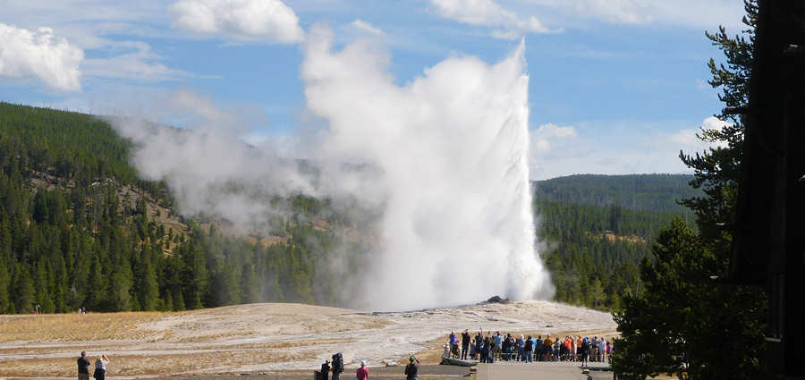 Und so gelangen wir auch im Verlauf der Tour zum Old Faithful, wo ich die gestern entwickelte Idee einer Zeitrafferaufnahme umsetze. Dazu suchen wir uns einen Platz in vorderster Reihe auf der Terrasse vom Old Faithful Inn und warten darauf, dass der alte Zuverlässige das macht, was man von ihm erwartet. Und er tut es.