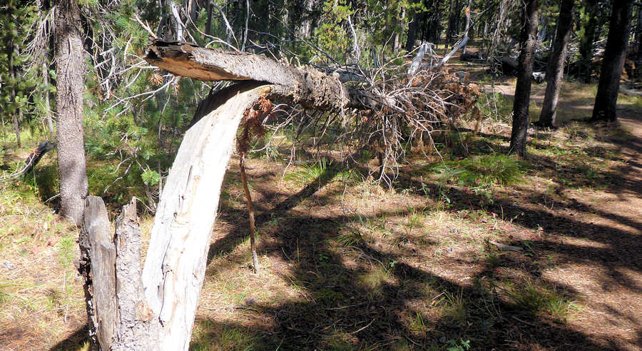 Was uns heute besonders fasziniert ist die Geräuschkulisse, und damit meine ich jetzt nicht die sog. Bärenglocken, mit denen man auf sich aufmerksam machen soll um eine überraschende Konfrontation mit einem Bären zu vermeiden, die aber stundenlang vor sich hin bimmelt und ganz schön nerven können. Ich meine damit die vielen anderen Geräusche. Heute ist es recht windig und die teilweise schon morschen Bäume wippen im Wind und ihr verknöchertes Holz gibt eine fast schon etwas gespenstische Atmosphäre. Anita meint, das seien bestimmt die Bäume aus Tolkins Mittelerde, die sich einfach nur ein wenig unterhalten....
