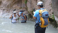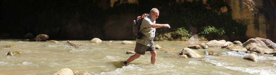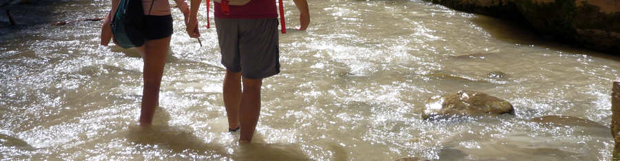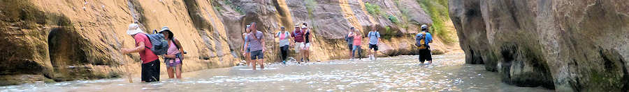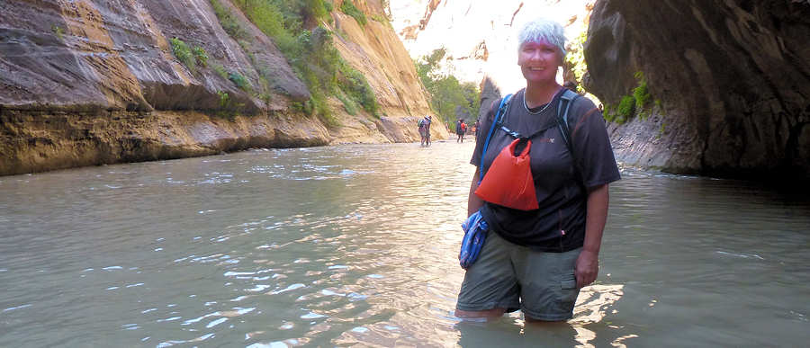 11.September 2015: Statt von den Weckern lassen wir uns heute von der Sonne wecken, die unser Zelt erhellt. Der Blick durch die Gaze bestätigt uns, dass das Campen eine Welt für sich ist, die wir nicht missen möchten. Vielleicht ist der Zeltboden nicht mit der bequemen Matratze eines gepflegten Motels zu vergleichen und die einzelnen Wirbel unserer Wirbelsäule werden mit ziemlicher Sicherheit im Laufe des Tages ihren ursprünglichen Platz finden. Und blaue Flecken vergehen nach einiger Zeit auf jeden Fall. Was aber bleibt ist dieser Blick auf die Zinnen des Zions oder jedes anderen Gebirgszuges, wenn die aufgehende Sonne sie langsam aufglühen lässt. Die sich langsam erwärmenden Nadelhölzer geben ihren Geruch ab, der sich aber schwer tut, sich gegen unsere Anziehsachen durchzusetzen, in denen sich das gestrige Lagerfeuer festgekrallt hat. Von einer Nachbarsite zieht schon der erste Kaffeeduft rüber und macht Appetit auf Frühstück und auf der anderen Nachbar-Site schaut verschlafen mit verwühlten Harren und zugekniffenen Augen ein Kopf aus dem Zelt und erschrocken stellen wir fest: "Ach du meine Güte, so sehen wir vermutlich auch aus.! Ja, das ist Camping in der Natur, auf das wir nie im Leben verzichten wollen!!! Nachdem wir -soweit das möglich ist- uns ansehnlich gemacht haben geht es zum Frühstück durch den Zion nach Mount Carmel ins Golden Hill. Erstaunt stellen wir fest, dass dort -teilweise auf deutsch- auch frische Backwaren angeboten werden. Die Bäckerei Forscher, die wir ja vor zwei Tagen kennenlernen konnten und nur etwa 5 Meilen entfernt ist, scheint aber nicht der Lieferant zu sein, vielmehr haben wir den Eindruck, es ist Konkurrenz. Wird der Südwesten nun plötzlich von deutschen Backwaren überflutet ? Nach dem Frühstück, bei dem der Scone selbstverständlich nicht fehlen darf, rüsten wir uns auf der Campsite für einen Hike durch den Virgin River auf. Dazu verstauen wir alle wasserempfindlichen Ausrüstungsgegenstände in wasserdichte Säcke und in einen Pelicase. Mit dem Shuttle geht es dann über 40 Minuten zum Temple of Sinawava und von hier aus führt ein asphaltierter Hike ungefähr eine Meile am Virgin River entlang. Er endet dann und jetzt geht es ins Wasser. Ein paar Hiker steigen zielbewusst und selbstsicher sofort in den Virgin River, andere kapitulieren an dieser Stelle und wiederum andere hadern mit der Entscheidung hineinzugehen, bis entweder die Vernunft oder die Neugierde und der Spaß siegen. 1993 waren wir erstmalig hier und gehörten eindeutig zu den Haderern. Völlig unvorbereitet hatten wir weder ein geeignetes Schuhwerk noch angemessenes Equipment, um die Kameraausrüstung zu schützen und nach unendlich langem Hin und Her gewann damals die Neugierde, nachdem ein anderer Hiker aus dem Virgin River zurückkommend von dem beeindruckendsten Wasserfall sprach, den er je gesehen hatte. Der Wasserfall erscheint nach etwa 300 Metern und entpuppte sich damals als Rinnsal, aber wir haben die Entscheidung für den Virgin River nie bedauert und sind mehrmals eingestiegen. So wie auch heute. Der Virgin führt heute wenig Wasser und so reicht der Wasserspiegel auf unserer Tour gerade mal bis zu den Oberschenkeln. Das haben wir auch schon anders erlebt. Es ist viel los heute: Die Temperatur des Virgins ist im Visitor Center mit 17 Grad angegeben, so dass das eine angenehme Erfrischung im Vergleich zu den Temperaturen im Zion ist. Um die 40 Grad sollen es heute sein und auch der gestrige Tag war in diesem Bereich. Also war unsere Entscheidung gegen den Kolob Arch ganz klar die richtige. ![]() ![]() ![]() ![]() ![]() Schlecht abschätzbar, wie weit wir in den Canyon gewatet sind, aber eine halbe Meile müsste es schon gewesen sein, bevor wir uns für den Rückweg entscheiden. Schließlich ist alles gutgegangen und keiner von uns beiden ist baden gegangen. Denn den Untergrund darf man nicht unterschätzen. Der Virgin wirbelt den Sandboden auf, so dass man nur erahnen kann, wo man hintritt. Über 30 Meter an einem Stück watet man gelegentlich bequem über reinen Sandboden bin man dann plötzlich wieder auf große Steine im Wasser trifft, die dafür prädestiniert sind, unangenehmen Kontakt mit den Zehen zu verursachen. Festes Schuhwerk oder zumindest vorne geschlossene Schuhe sind Pflicht. Unwissend haben wir mal den Fehler gemacht und sind mit offenen Survival-Sandalen durchs Wasser gelaufen. An den Macken der Zehen konnten wir jeden Stein identifizieren. Zurück am Trailhead trifft uns fast der Schlag. Unsere Uhren hatten wir wasserdicht verpackt und jetzt erst wird uns bewusst, dass es schon drei Uhr sind. Hier im Urlaub bei völliger Entspannung und mal ohne Uhr vergisst man Zeit und Raum. An der Canyon Lodge steigen wir wieder für eine Pause unter "unserem" Baum aus und bald schon geht es über unseren Campground wieder mal nach Hiurricane. Der Abstecher im gekühlten Wagen tut mehr als gut, denn die Temperatur auf unserer Campsite ist auf schwindelerregende 48Grad Celsius gestiegen. Erst glauben wir an eine Fehlmessung unseres Fahrzeuges doch die Temperatur nimmt erst beim Verlassen des Zion langsam etwas nach. Von daher ist der Ausflug nach Hiurricane in mehrfacher Sicht gut für uns: Ich muss unbedingt kurz ins Internet und Anita benötigt für unsere Hiking-Schuhe Schuhwachs, den wir leider vergessen haben, aus Deutschland mitzubringen. Beides erledigen wir mit Erfolg und schon geht es zurück auf die Campsites, um von hier aus noch einmal eine Tour durch den Zion mit dem Shuttle zu machen. Auf die etwas verwegene Idee sind wir gestern gekommen, als ein später Shuttle über die A3 durch unsere Campsite gefahren sind. Warum fahren wir denn nicht mal mit einem der letzten Busse am Tag durch? Und das machen wir jetzt und es entpuppt sich als eine hervorragende Entscheidung. Die meiste Zeit der Fahrt sind wir mit der Busfahrerin völlig allein und kommen mit ihr ins Gespräch. Darüber hinaus müssen wir alle paar Minuten unerwartet halten, we