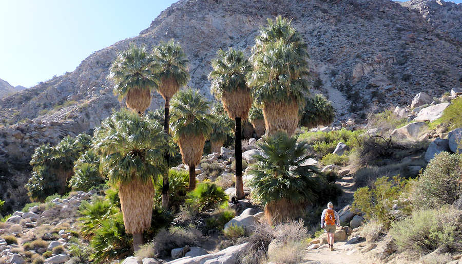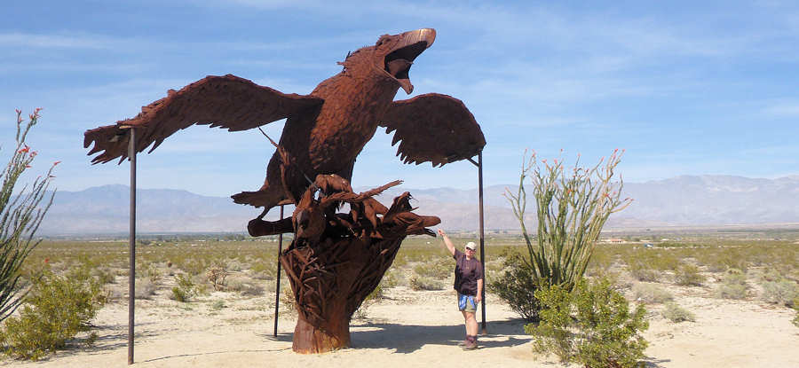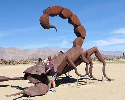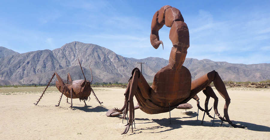 beiden Monster angeht sind wir heute überdimensioniert. Entgegen unserer Befürchtungen ist das Thermometer in der Nacht gerade mal auf 18 Grad gesunken, weshalb wir erst gegen 5 Uhr den Schlafsack überhaupt zugemacht haben. Diese Temperaturen haben wir nicht erwartet. Bevor es gleich losgeht zu unserer ersten Wanderungen komme ich noch mal kurz auf den Campground. Er ist sehr gepflegt, hat sogar einige Cabins und die sanitären Anlagen sind eher unüblich. Jede einzelne Toilette hat auch gleich ein Waschbecken, so dass das morgendliche und abendliche Waschen sehr diskret möglich ist. Und eine Dusche gibt es auch. Wo Licht, da leider auch (etwas) Schatten: Alles Wasser, was hier zu Verfügung steht, ist kein Trinkwasser. Also putzen wir uns auch die Zähne mit gekauftem Wasser. Aber wir sind nun mal in der Wüste. Unser erster Hike soll zur Palm Bowl gehen. Gleich vorweg: Es gibt knapp zwei Dutzend Trails, zumindest laut der Park-Zeitung. Von zwei längeren Trails einmal abgesehen haben alle anderen eine Länge von 0,5 bis max. 3 Meilen. Wir sehen uns fast schon unterfordert, wollen uns aber vorsichtshalber mal nicht zu weit aus dem Fenster hängen. Die Anfahrt zieht sich. Rund 40 Meilen heißt es zu fahren und lässt einem die Größe des Parks noch einmal vor Augen halten. Dafür finden sich immer wieder Gelegenheiten für einen Fotostopp, z.B. der Viewpoint Badlands ![]() Der Trail ist lediglich 2 Meilen lang (hin und zurück) und stellt keine wirkliche Herausforderung da. Er ist gut zu erkennen, in kurzen Sequenzen muss man mal über etwas Geröll klettern bis man dann die erste Oase mit einigen Palmen erreicht. Es ist zugleich der erste Schatten bis jetzt. Nach wenigen Minuten erreichen wir dann das Ziel: Die Palm-Bowl, eine Oase inmitten einer völlig dörren Canyon Landschaft, in der über 100 großgewachsene Palmen Schatten spenden. ![]() Obwohl es erst Mitte März ist freuen wir uns über diesen Schatten, denn die Temperaturen sind für diese Jahreszeit laut Zeitung der Parkranger völlig ungewöhnlich. Normalerweise sind die Durchschnittstemperaturen Mitte März zwischen 15Grad und 25Grad. Heute werden wir mit 30 Grad überrascht. Aber die Temperatur ist das eine. Das andere ist die kolossale Stärke, mit der die Sonne vom Himmel brennt. Womit wir außerdem belohnt werden? Wir sehen eine Vielzahl von Kakteen blühen, einige sogar das ersten Mal... ![]() Diese Ocotillos kennen wir sonst nur ohne Blüten und ohne Blätter, nur als vertrocknet aussehende braune Stängel. Nach ca. 10 bis 15 Minuten Fotostopp im Schatten geht es wieder zurück zum Trailhead. Ein paar junge Amerikaner fragen uns, ob der Hike gut ist und ob es Schatten gibt. Wir geben ihnen gerne unsere Eindrücke wieder: Schöner Hike, die meiste Zeit sehr offen aber zum Schluss wird man mit einer Idylle belohnt. Auf dem Rückweg geht es zunächst in Borrego Springs zum Market um dort ein paar Lebensmittel und vor allem Eis für die Kühlbox zu kaufen. Der Market ist ganz gut sortiert und wir nehmen vor dem Laden auch noch einen kleinen Snack ein. Während Anita clevererweise Obst wählt steht mir der Magen nach Chicken-Drumsticks. Aber irgendwie sind die arg fettig und bevor ich mir den Magen verderbe geht die Hälfte leider ungenutzt in die Tonne. Lebensmittel wegzuwerfen ist für uns ein "no go" aber ich habe sie wirklich nicht runtergekriegt. Im Visitor-Center erkundigen wir uns nach dem Wetter und sehen uns im Theater einen Informationsfilm an. Der Film ist gut und interessant gemacht aber der Beamer arg lichtschwach. Schade um die schönen Bilder, die so gar nicht richtig zur Geltung kommen. Auf dem Weg zurück zum Campground fahren wir wiederholt an großen, verrosteten Skulpturen vorbei, die Rückschlüsse über die Vergangenheit dieser Region in den verschiedenen Epochen geben. ![]() Zum Größenvergleich musste Anita die Nachzucht füttern... ![]() Zurück auf der Campsite stellen wir fest, dass Zelt und Bänke noch in der prallen Sonne stehen, weshalb wir kurzentschlossen den dem Campground gegenüberliegenden Cactus-Trail angehen wollen. Eine Loop von einer Meile ist doch ein guter Tagesausklang. Doch eine Meile kann auch anstrengend sein, wenn die Loop zunächst nur nach oben geht und es absolut keinen Schatten gibt. Die Sonne wird von dem kargen hellen Boden reflektiert und wir sind froh, die Loop nach 20 Minuten hinter uns zu haben. Auf die Schönheit der Loop, die -dem Namen entsprechend- durch Felder von Kakteen führt, haben wir uns gar nicht richtig konzentrieren können. Mittlerweile liegt etwas Schatten über der Campsite und wir lassen den Abend bei einem schönen Grillen ausklingen. Lagerfeuer gibt es heute nicht, weil der Parkranger schon Feierabend gemacht hat. Das verschieben wir eben auf morgen. Gute Nacht ! |