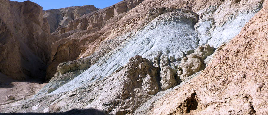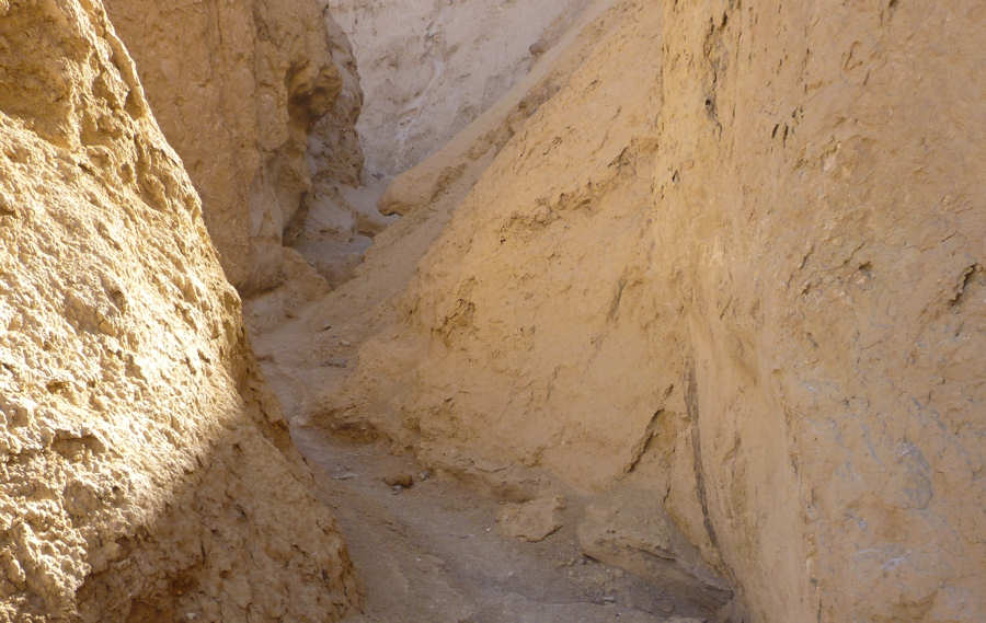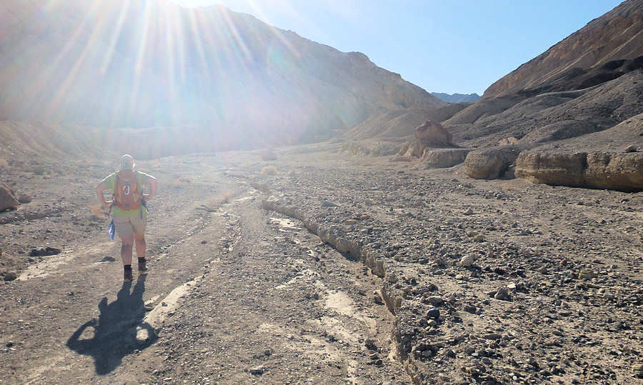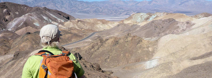 31.03.2016: Death Valley N.P. Das Wetter überzeugt uns beim Aufwachen, dass es sich drastisch ändern wird: Keine Wolke ist am Himmel zu sehen und es ist bereits angenehm warm als wir in den Wagen steigen. Wir starten mit einem ausgiebigen Frühstück, genau wie gestern: Für jeden eine halbe Bearclaw (ein ziemlich süßes Ding, vielleicht mit einem Mandelhörnchen vergleichbar), die wir jeweils am Vortag erstanden haben. Mehr als eine halbe Bearclaw und die Zähne kleben vermutlich zusammen. Unser Ziel ist der Desolation Canyon, dessen Trailhead in der Nähe der Badwater Road ist, unmittelbar neben dem Artist Drive. Den Trailhead und die ersten 200 Meter kenne ich bereits, da wir vor zwei oder drei Jahren auf der Suche nach den damaligen Drehorten von Star Wars waren und ein Movie Set genau hier lag. Der Trail verspricht einen 3-Meilen-Roundtrail, der durch engere Canyons gehen soll und farbprächtige Felsen bietet. Allerdings ist es kein ausmarkierter Trail. Offensichtlich gehört er zu den weniger frequentierten Trails, denn unser Wagen ist das einzige Fahrzeug am Trailhead. Wir starten, gehen um eine Felsgruppe in Richtung Süden, eine große und breite Wash entgegen. ![]() Nach einiger Zeit verjüngt sich die Wash und die Durchgänge werden zunehmend enger. ![]() Wohin der Weg wohl führen mag ist nicht zu erahnen, denn es geht Kurve für Kurve abwechselnd nach links und dann wieder nach rechts und kontinuierlich, wenn auch wenig ansteigend, nach oben. Die Canyonwände sind recht hoch, so dass ein schnelles Hochklettern, um die Lage zu peilen, nicht möglich ist. ![]() Nach einiger Zeit erreichen wir erste Felsstufen. Die erste hat eine Höhe von gut 2 Metern und bevor wir uns entscheiden sie hochzuklettern schauen wir uns den Rock gut an, ob wir ihn denn anschließend auch wieder runterklettern können. Aber das scheint kein Problem zu werden und so kann uns nichts mehr aufhalten. Zwei weitere, weniger hohe Stufen heißt es hochzuklettern und der Weg macht weiterhin das, was wir eben beschrieben haben: Er geht hoch und links- und rechtsherum. Er verrät nicht, wohin er gehen mag. Drei Meilen Roundtrip heißt 1,5 Meilen hin und 1,5 Meilen zurück. Unser GPS-Gerät sagt uns, dass wir die 1,5 Meilen bereits überschritten haben, wobei man in dem engen Canyon natürlich berücksichtigen muss, dass nicht immer ein GPS-Signal zu empfangen ist und die gemessenen Werte daher nicht 100 Prozent richtig sind. In jeder Windung des Trails sichern wir uns zu, dass wir bis zur nächsten Kurve gehen und dann, wenn sich der Weg weiter weigert uns zu sagen, wo er hin will, wir umkehren werden. Soweit unser Vorhaben: Wir gehen aber immer weiter und Anita spekuliert, ob mit Roundtrip vielleicht gemeint ist, dass der Weg letztlich wieder zum Trailhead führt. Dafür spricht, dass der Weg -trotz anderer Hinweise in der Park-Zeitung, immer noch markiert ist, wenn auch nur rudimentär. Gegen Anitas These spricht, dass ein solcher Rundweg üblicherweise als "Loop" bezeichnet wird. Nach etwa 3,5 km sind wir schon ziemlich weit aufgestiegen (ca. 240Meter), können in rund 200 Meter ein Stück vom Artist Drive erkennen und sehen keine Markierungen mehr. ![]() Es sieht so aus als würde der Weg hier nun enden, hoch oben auf dem Gipfel einer Anhöhe. Der Blick ist beeindruckend und wir genießen den Ausblick "mental und digital". ![]() Wir hätten jetzt grundsätzlich die Möglichkeit, die 200 Meter bis zum Artist Drive zu gehen, den dann entlang zu wandern bis zur Badwater Road und diese dann bis zum Abzweiger der unpaved Road, die zum Trailhead führt. Uns scheint es einfacher und vor allem interessanter zu sein, den bisherigen Weg wieder zurückzugehen. Das machen wir auch. Wir begegnen auf dem Rückweg noch eine Familie, ansonsten sind wir -wie wir es gerne haben- völlig einsam unterwegs. Kurzer Rückblick auf diesen Trail: Wir sind begeistert, von den kleinen Klettereinlagen über die teilweise engen Canyons und die farbenprächtige Felsen bis zu dem Ausblick, der einen am Ende überrascht. In den Sommermonaten sollte man Abstand nehmen, ihn zu gehen, denn die Schatten sind trotz der hohen Felswände rar und er beginnt schließlich weit unter Meereshöhe. Und bei aufkommendem Regen sollte er auf jeden Fall gemieden werden, denn die schmalen Canyons und die Wash sind prädestiniert, sofort vollzulaufen und zu einem reißenden Gewässer zu werden. Aber ansonsten ist er aus unserer Sicht wirklich empfehlenswert. Wir fahren eine Runde über den Artist Drive um herauszubekommen, von wo aus wir vorhin auf den Drive sehen konnten. Aus dieser Perspektive ist es schwer, diesen Punkt auszumachen aber eine Markierung im GPS-Gerät gibt uns einen ungefähren Anhaltspunkt. Nach dieser Rundfahrt landen wir wieder in Furnace Creek zu einem Snack auf den Schaukelstühlen, die es nicht gibt. Die nächste Station ist der Ranger bei Stovepipe Wells, bei dem wir uns versichern lassen, dass wir morgen mit unserem Wagen die Dirt Road befahren können, die uns zum Trailhead zu den Darwin Falls führen soll. Anschließend geht es an den Pool unseres Motels. Schließlich müssen wir ihn auch nutzen, wenn wir uns doch schon beschweren wollten. Wir sind alleine im Pool und können so ausgiebig mit dem neuen Kamerasystem Unterwasserbilder machen. Wir sind halt einfach ein wenig verspielt. Auf dem Zimmer gibt s noch einen Kaffee, bevor es dann zum Essen nach Panamint geht. Auf dem Weg dorthin entstehen noch einige wichtige Aufnahmen für unsere spätere Dia-Show. Zurück in Stovepipe Wells spazieren wir noch mal kurz durch den Gift-Shop, erkennen wir, dass am Pool alle Liegen besetzt sind und versuchen ein wenig durch das World Wide Web zu surfen. Vergebens: Es findet gerade eine Konferenz statt und alle Beteiligten sitzen mit ihren Laptops und greifen vermutlich sämtliche Kapazität der Internet-Verbindung ab. Na gut, dann gehen wir halt ins Zimmer dem Üblichen nach: Speichern, Sichern, Überspielen, na ja, das kennt man ja schon