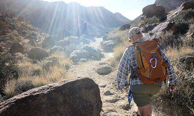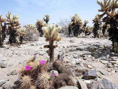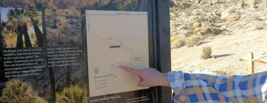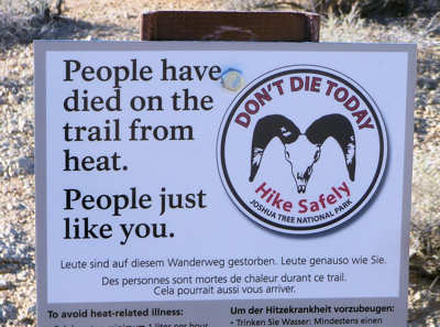 22.03.2016: Joshua Tree N.P. Unsere gestrige Vermutung, dass es nachts deutlich kälter wird als in Anza Borrego hat sich in der Nacht bestätigt. Irgendwann in der Nacht bin ich mal aufgewacht und glaubte mich schon allein im Zelt, bis ich Anita dann weit unten in ihrem Schlafsack doch noch entdecken konnte. Wieder gehen die Wecker in aller Frühe aber wir brauchen ein wenig, bis wir aufgetaut sind. Na ja, ganz so schlimm ist es nun doch nicht und einmal aus dem Zelt gekrochen und tief Luft geholt lässt es sich recht gut aushalten. Der morgendliche Blick von unserer Campsite entschädigt uns abermals von allen Strapazen. ![]() Die Morgentoilette reduziert sich auf eine Katzenwäsche auf der Campsite und schon geht es los. Unsere trink- und feierfreudigen Nachbarn kriegen noch nichts mit von unserem Aufbruch. Unser erster Hike heute soll der 49Palms-Trail sein und uns zu einer weiteren Oase führen, aus 49 Palmen bestehend. Dazu verlassen wir den Park zunächst um ihn an anderer Stelle wieder zu betreten. Auf dem Parkplatz stehen nur zwei Fahrzeuge, was die ersehnte Einsamkeit verspricht. Am Trailhead sind wir etwas überrascht. Der Trail ist mit 2 mal 1,5 Meilen und nur 91 Meter Aufstieg als "moderate" klassifiziert. ![]() Allerdings ist das Profil des Trails so, dass wir auf dem Hinweg auf 1,5 Meilen 91 Meter Aufstieg haben werden und auf dem Rückweg das ganze nochmals. Widersprüchlich zur Klassifizierung sind jedoch die Gefahrenhinweise: ![]() Vermutlich steht die Gefahr des Trails in direktem Zusammenhang mit den Temperaturen. Die sind mittlerweile im Gegensatz zur Nacht deutlich angestiegen aber sehr gemäßigt. Zumindest haben wir noch die dicken Hemden über den Shirts. ![]() Nach etwa 1,5 Meilen, auf denen uns lediglich ein Jogger-Pärchen überholt hat, erreichen wir die versprochene Oase, die schon von einiger Zeit auf sich aufmerksam gemacht hat. ![]() Ob es nun wirklich (noch) 49 Palmen sind überprüfen wir nicht, stattdessen pausieren wir im Schatten der Palmen. Obwohl es nicht heiß ist hat auch hier im Joshua die Sonne bereits an Kraft gewonnen und brennt ziemlich. ![]() Eigentlich haben wir die Pause gar nicht nötig, aber sie gehört nun mal einfach zu einem Hike hinzu. Wie gut es ist, bereits früh zu starten, wird uns nun noch einmal drastisch vor Augen gehalten. Nach wenigen Minuten kommt eine Masse an einzelnen Hikern und stürmen die Oase. Wir verabschieden uns ziemlich schnell und gehen zurück zum Trailhead. Mittlerweile ist Wind aufgekommen, der uns hin und wieder etwas frösteln lässt. Als nächstes steuern wir das Visitor Center an, wo der Garten derzeit in voller Blüte ist. ![]() Nach einem kurzen Rundgang steuern wir den Cholla-Cactus-Garden. ![]() Der Weg führt uns, wie der Name des Gartens schon verrät, durch eine riesige Ansammlung von Chollas, von denen viele in er Blüte sind. ![]() ![]() Statt weiter zu Wandern verlassen wir uns jetzt auf unseren Wagen und befahren eine längere aber völlig anspruchslose Off-Road-Strecke. ![]() Ich betone das so, weil ich früher einen Riesenspaß hatte, mit Geländewagen anspruchsvollere Off-Road-Sektionen zu bestreiten. Aber mit dem Alter wird man wohl weiser oder zumindest vorsichtiger und jetzt sind wir beide froh, ohne Gefahren wo anzukommen. Aber etwas Gelände muss nun doch geschnuppert werden. Der Weg führt uns in ziemlicher Einsamkeit durch ein flaches Gelände. Die Straße ist gesäumt von Joshuas, deren Größe im Vergleich zu unserem Auto zu erahnen ist. ![]() Nach diesem Trip geht es in die Zivilisation zurück nach Yucca Valley, wo wir zunächst beim Walmart ergebnislos shoppen (oder eben "nicht shoppen") und dann zu Mittag essen, nämlich beim Panda-Express. Den haben wir aufgrund einer aufmerksamen Leserin unserer HP im letzten Jahr wieder entdeckt. Wieder zurück im Park starten wir zum Barker-Dam, einem kurzen Trail (ca. 1 Meile). ![]() Erschlagen werden wir von der Masse an Menschen, die unseren Hike begleiten. ![]() In der Mitte der Loop gelangen wir an den eigentlichen Damm, der im letzten Jahrhundert von Farmern gebaut wurde, um mit dem angestauten Wasser ihr Vieh zu tränken. Aufgrund der vorherrschenden Dürre in der Folgezeit wurde die Viehzucht hier vor Ort aufgegeben und damit auch der Damm. Leider erfreute sich der Damm der Leidenschaft von Sprayern. Trotz großer Bemühungen der Ranger sind die Graffitis kaum zu entfernen. ![]() Nach diesem Hike geht es zurück zur Campsite. Unsere Party-Nachbarn sind weg, der Krach am Abend jedoch nicht. Eine vielköpfige Familie neben uns erfreut sich einer recht lauten Kommunikation und es dauert eine ganze Zeit, bis sie sich der Idylle und Stille dieses Landstrichs anpasst. Aber wir dürfen uns ja nicht beschweren. Wir wollen es ja so: Camping statt Motel! Und der Blick auf den gerade aufgegangenen Mond (morgen ist Vollmond) bestätigt uns in dieser Entscheidung. ![]() Also dann, hinein ins nächtliche (fröstelnde) Vergnügen. |
