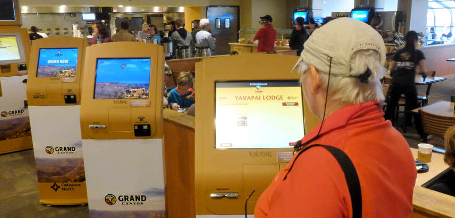 Market Plaza noch einen Parkplatz. Im neu renovierten Cafe werden wir mit einer neuen Technik überrascht. Statt direkt zu den Ausgabeplätzen zu gehen bestellt man nun mehr oder weniger online an Automaten.