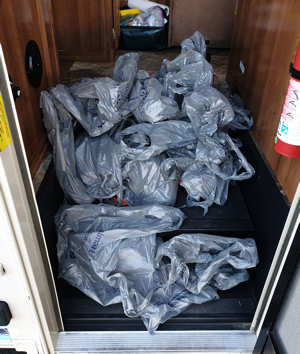 Shuttle vom Vermieter abholen wird. ![]() So der Plan: Wir warten bis nach 8:00 Uhr bis der Shuttle endlich ankommt; also über eine Stunde des Wartens. Es ist zwar ziemlich kühl aber nicht langweilig, weil viele Busse ankommen und Hunderte von Touristen aufnehmen. Fast alles Asiaten. Und wenn es keine Asiaten sind, dann kommen kleinere Shuttles, um Touristen zu irgendwelchen Attraktionen abzuholen: Vom Maschinengewehr-Schießen über Sightseeing im Umland oder sogar zu Hubschrauber-Rundflügen. Hätten wir auch mal wieder Lust. Der Halbtagesflug vor vielen Jahren hinein in den Grand Canyon und runter zum Colorado ist in bester Erinnerung. Der Shuttle ist da und zum ersten Mal sind wir nicht die einzigen Gäste im Shuttle. Kein Wort der Entschuldigung wegen der Verspätung und einer der beiden Scheine, die für den Tip gedacht waren, verschwindet wieder in der Geldbörse. Unserem üblichen Fahrer wäre das -so unsere Vermutung- bestimmt nicht passiert. Nach kurzer Zeit erreichen wir die Vermietstation und wir merken, dass einer der anderen Fahrgäste, der wohl der Chef der Gruppe zu sein scheint, hektisch wird und sich aufmacht uns auszutricksen um als erster am Counter zu sein. Es ist ja überhaupt nicht unsere Art aber jetzt fühlen wir uns herausgefordert, dem Einhalt zu gewähren: Während ich in aller Ruhe zum Kofferraum gehe um unsere zwei kleinen Taschen rauszuholen, steuert Anita ebenso ruhig wie bestimmt zum Schalter. Und während die Konkurrenz noch damit beschäftigt ist ihre Containerähnlichen Koffer auszuladen stehen wir bereits am Schalter. Die Mitarbeiterin erinnert sich an uns (ist das jetzt positiv oder negativ zu werten?) und weist uns sofort einem Schalter zu. Damit erspart sie uns den üblichen Einweisungsfilm. Die Konkurrenz kommt hingegen nicht daran vorbei, sich den durchaus interessanten und lehrreichen Film anzusehen. Alle Daten von uns hatten wir bereits online übertragen und dennoch muss die nette Mitarbeiterin sämtliche Eintragungen auf Papier übertragen, aber davon hatte ich ja schon bei den letzten Touren berichtet. Wir haben uns wieder für den Titan entschieden, also ein "handliches" Wohnmobil mit knapp 11 Metern. Einmal zufällig daran geschnuppert (Man hatte uns damals ein größeres Fahrzeug als bestellt zukommen lassen) und schon haben wir 2018 angebissen. Die Übernahme dauert heute aber ungewöhnlich lange und das hat mehrere Gründe: Der Wagen muss noch "gedumpt" werden (also die Abwassertanks werden geleert) und wir ordern diesmal eine Fahrradhalterung. Zwar sind wir im Frühjahr ohne Halterung ausgekommen und konnten die Falträder im Kofferraum verstauen, aber das klappt nicht immer, weil es die RVs -obwohl es das selbe Modell ist- je nach Baujahr in unterschiedlicher Konfiguration gibt. Die Übernahme dauert noch länger, weil wir jetzt einen anderen Wagen bekommen werden, denn beim ursprünglichen Wagen sprang der Generator nicht an. Endlich ist es soweit und wir werden in den Wagen eingewiesen. Ernüchternd ist, dass der Wagen zum ersten Mal tatsächlich etwas älter ist und einen etwas verlebten Eindruck macht. 60.000Meilen hat er auf dem Tacho und an jeder Ecke sind kleinere Kratzer, innen wie außen. Der Vorteil eines älteren Fahrzeugs ist jedoch, dass die ersten Macken eines Neuwagens bereits behoben sind. Darüber hinaus gibt es weniger Probleme, wenn trotz aller Vorsicht noch paar kleine Kratzer hinzukommen sollten. Die Mitarbeiterin von El Monte notiert sich jeden Kratzer im Innenraum, außen und vor allem in der Windschutzscheibe. Erfreulich: Diesmal funktioniert auch die Rückfahrkamera. Anita stellt schnell fest, dass es sich um das alte Modell handelt und somit war es vorausschauend, einen Fahrradträger zu mieten, denn dieses Modell hat keinen Platz im Kofferraum für 2 Räder. Das ist gar nicht einfach, denn CU-Camper, bei denen wir den Wagen gebucht haben, teilte uns damals mit, dass sie das nicht für uns buchen können; El Monte international hingegen behauptete im Vorfeld, dass die Station in Las Vegas keine anbietet aber zum Glück hatten wir im Frühjahr bei der Abgabe "unsere" Mitarbeiterin befragt. Die hatte uns nämlich bestätigt, dass die vorrätig sind. Es gibt wohl zwei Modelle: die preiswertere Variante wird am Heck an der Leiter befestigt (Miete $25) und die Alternative, für die wir uns entschieden haben, kommt auf die Anhängerkupplung und kann bis zu vier Fahrräder aufnehmen ($50). Und jetzt kommt noch ein großes Danke an die "Reisegruppe Sonnenschein". An den Vermietstationen ist es üblich, dass man übrig gebliebene Utensilien der Tour, z.B. Holz, Anzünder, Besteck aber auch Lebensmittel, für die nachfolgenden Reisenden in einem Regal deponiert. Hier kann man sich kostenlos bedienen. Wir haben schon oft Utensilien deponiert und auch übernommen. Gerade kommt die o.g. neunköpfige Reisegruppe mit vier RVs an und entledigt sich ihrer übriggebliebener Ausstattung bzw. wir werden angesprochen, ob wir nicht das eine oder andere nehmen wollen. Wir werden also von dieser ausgesprochen netten Reisgruppe mit Nudeln, Wasser und Dosenfleisch bestens versorgt. An der Stelle nochmals: Herzlichen Dank und wir hoffen, ihr seid gut heim gekommen. Wir verlassen den Vermieter und fahren zum Storage, um unser Equipment aufzunehmen. Weit weniger als eine Stunde benötigen wir und schon ist der Storage gefühlt leer und der Wagen voll. Wie immer geht es anschließend zum Walmart um für die nächsten zwei Wochen einzukaufen: Wasser, Cola, Orangensaft, Knack und Back, Milch, Bohnen, Grillgut...die Liste würde noch mehrere Zeilen in Anspruch nehmen. ![]() Erschreckender als der Endbetrag ist die Flut von Plastiktüten, in denen unser Einkauf verschwindet. Wir machen uns die Mühe zu zählen: 5? 10? Etwa sogar 15 Tüten? ![]() (Die 24 Tüten im Eingangsbereich vom Auto) Nein, 24 Tüten zählen wir. Gut, wir nutzen die Tüten anschließend immer als Mülltüten im RV, aber so viele brauchen wir dann doch nicht. Der Rest di