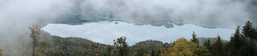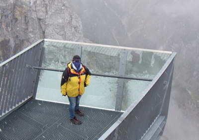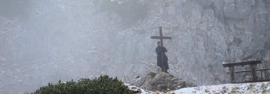 die Tiefe hautnah erlebt werden kann. Wieder regnet es morgens und wir warten ab, bis wir ein trockenes Zeitfenster haben. Statt mit dem Bus zu fahren gehen wir die Strecke vom Campingplatz bis zur Talstation der Alpspitzbahn zu Fuß, die wir nach etwa gut einer halben Stunde und 2,5Kilometern erreicht haben. Auf dem Display ist zu sehen, dass die nächste Bergfahrt um genau 10:00Uhr beginnt, also in 4 Minuten. Alles klappt bestens. Die aus bis zu drei Gondel-Fahrten bestehende Garmisch-Classic kostet 29,00€ pro Person. Hätten wir vorgestern mit der Bergfahrt zur Zugspitze ein Kombiticket erstanden, hätten wir 9,00€/Person gespart. Aber das wollten wir nicht, da vorgestern noch unklar war, ob wir heute überhaupt hier hochfahren werden. Die Gondel ist kleiner als die der Zugspitzbahn aber mit den gerade mal 6 Leuten hier an Bord kommt auch hier kein Gefühl der Enge auf. Aber eins muss ja mal gesagt werden: Diese Touren in den USA hätten einen anderen Charakter: Es gäbe einen Gondelführer, der gleich mit Witz und Begeisterung gestartet wäre: "Hi Folks, my Name is Jeff and I am your Guide on the ride to one of the famoust mountains of the world [oder] highest" oder oldest oder oder oder. Er hätte seine Jokes gemacht, in etwa: "Aussteigen während der Fahrt ist nicht erlaubt aber auch nicht empfehlenswert". Auf jeden Fall wären wir alle erheitert, begeistert und hätten vermutlich auch noch so Dinge erfahren, dass die Stelzen der Bahn aus xy Tonnen Stahl bestehen oder irgendwas. Was ich sagen möchte: In den USA liefe das interessanter und erheiternder ab. Andersrum betrachtet: Auf dieser Fahrt können wir uns einzig auf die vorbei rauschende Landschaft konzentrieren, denn kein einziges Wort des Gondelführers lenkt uns ab. Oben angekommen sind es nur wenige Meter bis zu der fast schwebend aussehenden Aussíchtsplattform AlpspiX. ![]() E ntgegen unserer Vorstellung ist der Boden dieser Plattform nicht aus Glas sondern auf Metallgittern, was vielleicht bei dieser Witterung beständiger ist. Auf der Plattform herrscht ein scharfer und eisigkalter Wind, so dass wir nicht einige Minuten sondern eher nur einige Sekunden dort verweilen. ![]() Von der Plattform aus kann man durch das Bodengitter rund 1.000 Meter in die Tiefe blicken. ![]() kurzein paar Sekunden runter zu schauen. Aber für ein paar Bilder reicht es auf jeden Fall. Der Blick in die Ferne oder ins Tal reduziert sich auf wenige Meter: Es herrscht dicker Nebel und wir sehen eigentlich nur eine weiße Wand. ![]() Wie geht es jetzt weiter? Das klären und planen wir im Restaurant bei einem heißen Kaffee. ![]() Dabei beobachten wir eine mysteriöse Szene. Eine Nonne geht den Berg hoch bis zum Gipfelkreuz, umklammert es und verharrt trotz des Windes und der Kälte mehrere Minuten. ![]() Zurück zu unseren Planungen. Es gibt wieder zwei Möglichkeiten: a) Mit der selben Seilbahn, mit der wir eben hochgekommen sind, wieder runterfahren. b) Mit der Hochalmbahn, die hier ebenfalls endet, auf etwa 1.700Meter runter zu fahren. Nach einem rund 30minütigen Gehweg landet man dann an der Bergstation der Kreuzeckbahn, die einen runter zur Talstation und unserem heutigen Ausgangspunkt bringt. Was bedeuten denn 30 Minuten Gehen? Nach dem gestrigen Erlebnis hinsichtlich eines angeblich 30 minütigen Gehweges sind wir vorsichtig geworden. Auch im Internet finden wir nur Angaben zur Laufzeit, nicht jedoch zur Länge des Weges oder der Steilheit/Gefälle. Irgendwo entdecken wir dann einen versteckten Hinweis, dass der Weg von der Talstation der Hochalmbahn bis zur Bergstation der Kreuzeckbahn als "leicht" deklariert wird. Wir entschließen uns, nach der wärmenden Tasse Kaffee mit der Hochalmbahn runter zu fahren und uns dort einen Eindruck vom Weg und der Witterung zu verschaffen. Ist es steil, kalt und schneebedeckt kehren wir einfach mit der Seilbahn wieder hier hin zurück. Wir gehen zur Bergstation der Hochalmbahn, sie ist nur wenige Schritte von der Bahn entfernt, mit der wir vorhin hier oben angekommen sind. Kein Hinweis, wann unsere Talfahrt beginnen wird und auch kein Maschinist weit und breit zu sehen. Ein weiteres Paar kommt hinzu und wartet ebenfalls mit vielen Fragezeichen im Gesicht. ![]() Plötzlich hören wir eine Durchsage mit der Bitte einzusteigen. Gehört - getan und plötzlich setzt sich die Gondel mit uns aber ohne Gondelführer wie von Geisterhand in Bewegung. Wir sind überrascht und Anita und mir fällt ein, dass wir so etwas vor Jahren schon mal in einem spannenden Agentenfilm gesehen haben. Dort öffnete sich allerdings auch automatisch die Bodenplatte.... Das bleibt uns erspart und führerlos wie von Geisterhand erreichen wir die Talstation. Wieder öffnen sich die Türen automatisch und per Durchsage werden wir gebeten, die Gondel zu verlassen. Von uns vieren einmal abgesehen ist weit und breit kein Mensch zu sehen. Fast schon ein wenig beängstigend. Während wir noch die Hinweisschilder studieren setzt sich die Gondel wieder in Bewegung nach oben. Die Luft hier auf 1700 Metern ist angenehm: Zwar herrscht hier Nebel, aber dafür ist es einige Grade wärmer als oben auf dem Gipfel, es gibt keinen Wind, keinen Schnee und der Weg ist hervorragend ausgebaut. ![]() Also werden wir jetzt über den sogenannten Genuss-Erlebnis-Weg zur Bergstation der Kreuzeckbahn gehen. Der Weg heißt deshalb so, weil es auf dem Weg immer wieder kleinere Mitmach-Stationen gibt, die für Kinder aber auch Erwachsene eine nette Geschichte erzählen. ![]() Die letzte Etappe unserer Garmisch-Classic ist wieder eine übliche Bahn im Endlosbetrieb. Der Mitarbeiter, der oben darauf achtet, dass die Ankommenden auch die Gondel verlassen, reagiert noch nicht einmal auf unser "Grüß Gott". Wir genießen zu zweit in der Gondel unsere voraussichtlich letzte Gondelfahrt für diesen Urlaub. Und Genießen ist das richtig Wort, denn wir schweben mit der Gondel über die schon weltberühmte "Kandahar", also jene sehr bekannte und auf dem letzten Abschn