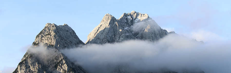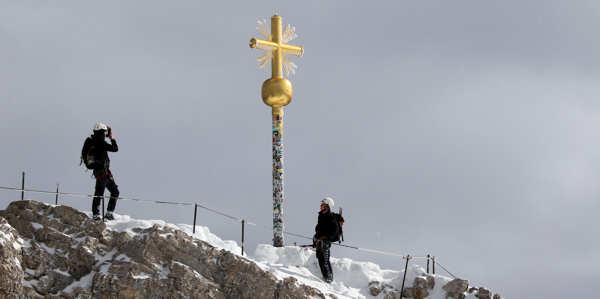 noch Zeit für ein Frühstück im Camper. Nach 20 Minuten erreichen wir die Talstation der Zugspitzbahn. Die Fahrt mit dem Bus ist schon ein Erlebnis: Die Fahrt führt u.a. durch eine sehr enge Straße, zwischen Häusern entlang und an einer Stelle hat man den Eindruck, man fährt durch die Vorgärten. Die Hygieneregeln in der Talstation werden groß geschrieben: Schon beim Eintritt wird auf die Maskenpflicht hingewiesen und immer wieder finden sich Desinfektionsstationen. Wir kommen "just in time" und haben Glück, sofort mit der Gondel aufsteigen zu können. ![]() Die Gondeln sind riesig um dem möglichen Ansturm zu Spitzenzeiten zu genügen. Uns geht durch den Kopf, dass wir gut daran getan haben (also Anita), die Tour so zu planen, dass wir einerseits in der Nebensaison und andererseits auch nicht am Wochenende hier vor Ort sind. Denn gestern, am Sonntag, war hier deutlich mehr los. Jetzt aber sind wir nur mit wenigen Mitreisenden in der Gondel. ![]() Die Bergfahrt dauert rund 10 Minuten und bietet trotz des Wetters spektakuläre Aussichten. ![]() ![]() ![]() Oben auf 2962 Metern angekommen begrüßt uns eine Temperatur von -4 Grad Celsius und ein kräftiger Wind. Damit stehen wir zwar nicht auf dem Dach der Welt, jedoch auf dem Dach Deutschlands, denn die Zugspitze ist bekanntermaßen der höchste Berg in Deutschland. Von oben sieht man gar nicht mehr, von wo wir gerade hochgekommen sind. Das Panorama ist beeindruckend, obwohl uns Nebel und Regenwolken den Blick in die Ferne trüben. Der Wind ist eisig und lässt alle unbedeckten Körperteile fast schon einfrieren. Das hindert uns natürlich nicht die Fotoapparate heiß laufen zu lassen. ![]() Unser Plan war es ja immer, die Zugspitze zu erklettern. |