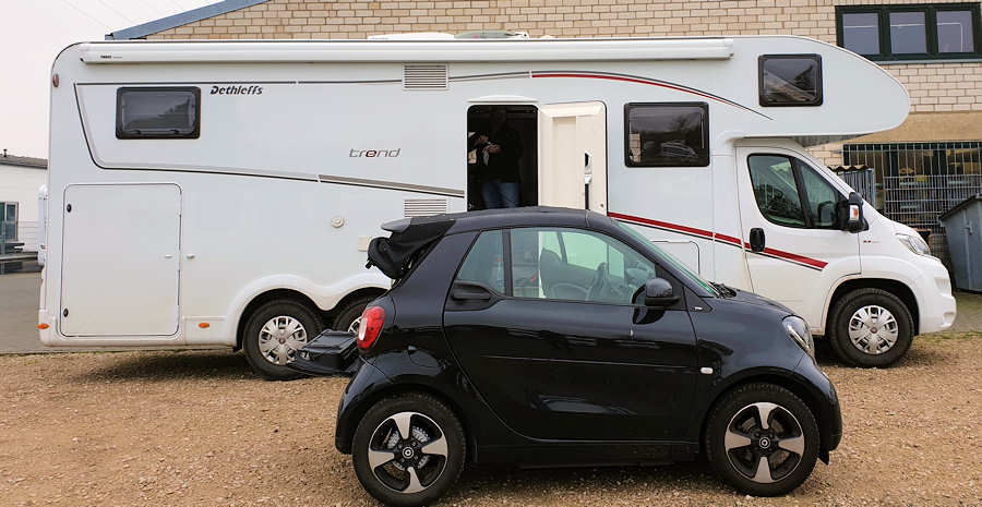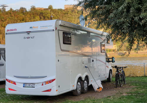 Corona-sicheren Alternative umgesehen hatten. Noch vor 9:00 Uhr verlassen wir unseren Bungalow. Professionell wie sonst auch in Amerika haben wir am Vorabend schon alles sortiert nach a) bleibt in Köln und b) wird auf die Tour mitgenommen. In Köln angekommen gehen wir erst noch Lebensmittel einkaufen. Weshalb? Leider können wir unseren Camper erst um 15:30 Uhr in Kerpen übernehmen, d.h. einschl. einer etwa einstündigen Einführung kommen wir erst gegen 16:30 Uhr los, müssen dann nach Köln, den Wagen einräumen und müssten dann erst noch einkaufen. Dabei hatten wir im Vorfeld bereits einen Supermarkt ausgespäht, der einen genügend großen Parkplatz für unseren Bus hat. Also konkret: Wir fahren in Köln einkaufen und dann geht es mit dem ersten kleinen Gepäck in unserem Smart nach Kerpen. Die Übergabe ist sehr freundlich. Die Frage, ob wir uns mit Wohnmobilen auskennen, müssen wir mit einem klaren "Jein" beantworten. Zwar haben wir jetzt schon ein paar Jahre WoMo-Erfahrung, allerdings nur mit amerikanischen. Der große Unterschied ist, und da haben wir nur Erfahrungen von YouTube, das Abwassersystem. Bei den amerikanischen Wohnmobilen gibt es unten am Wohnmobil einen gemeinsamen Auslass und über zwei getrennte Ventile für sog. Greywater (Abwasser aus Küche, Dusche und Wachbecken) und Blackwater (Abwasser aus der Toilette) gelangt beides über einen Schlauch in das Loch einer Dumpingstation. In Deutschland (und vielleicht auch in ganz Europa?) werden die Abwässer streng getrennt. Das Greywater wird über ein Ventil entsorgt, wobei man den Wagen einfach über einen Gulli fährt. Das Blackwater wird jedoch in Kassetten aufgefangen und die müssen auf Toiletten entleert werden. Nach gut einer halben Stunde, also deutlich schneller als kalkuliert, sind wir eingewiesen und verlassen den Hof des Vermieters in Richtung Zuhause. Dort haben wir alles Material in großen Taschen verstaut, die darauf warten, ins WoMo getragen zu werden. Ein großes Problem: Mit einem fast neun Meter langen Gefährt in der Innenstadt einer Großstadt eine Parkmöglichkeit zu finden. Also parken wir in der Nähe und müssen etwas laufen. Beim Anblick der 10 großen Taschen wird mir schon etwas schwindelig: Nehmen wir in den USA auch soviel mit auf Tour? Vermutlich deutlich mehr, aber dort tragen oder fahren wir alles Equipment vom Storage in kleinen Happen nach unten und es kommt uns nicht so viel vor. Gegen 17:00 Uhr ist alles verstaut, was ich jetzt sofort wieder revidieren muss. Es ist alles an Board aber nicht wirklich verstaut sondern alle Taschen stehen noch gepackt rum. Wir nehmen uns vor, auf der Tour einen kleinen Videoclip zu erstellen und zwar nicht über dieses Wohnmobil im Speziellen (dazu gibt es gute Clips, die sicherlich besser sind als wir sie machen könnten) sondern über den Unterschied, den wir jetzt im Vergleich zu den vielen USA-Campern erleben. Der erste Eindruck schon mal vorweg: Ist er besser als ein USA-Camper? Die Antwort ist ein klares "Jein!" Bis 19:00 Uhr ist die Rezeption des Campingplatzes "Sonneneck" bei Boppard besetzt und es zeichnet sich schon ab, dass wir bis dahin nicht eintreffen werden. Telefonisch kündigen wir, wie bei der Reservierung vereinbart, unsere Verspätung an. Etwa gegen 19:30Uhr erreichen wir den Campingplatz und wie man uns am Telefon sagte, fahren wir an der Rezeption rechts daran vorbei und dann Richtung Rhein bis zur Campsite 16. Jetzt ist mit der amerikanische Begriff rausgerutscht, es heißt natürlich "Stellplatz 16". Vor uns steht ein Wohnmobil und hinter uns ein Wohnwagen, so dass wir etwas rangieren müssen um genau in die Lücke zu passen. Tja, amerikanische Campingplätze sehen in der Regel anders aus und bieten deutlich mehr Platz, von den kommerziellen KOA-Plätzen mal abgesehen. Dafür ist der Stellplatz bzw. der Ausblick kaum zu überbieten. Mit der Längsseite stehen wir weniger als 10 Meter vom Rhein entfernt. Wir haben wenig Zeit den Ausblick zu genießen, denn jetzt müssen wir die Inhalte der Taschen in den Schränken verpacken. Gegen 21:00 Uhr haben wir uns mit den Unterbringungsmöglichkeiten vertraut gemacht und alles ist verstaut. Jetzt bleibt noch Zelt für das Abendessen und dann wird auch schon bald ins Bett geklettert. Das mit dem Klettern ist wirklich so gemeint, denn das Raumwunder fordert sein Tribut. Das hintere Bett ist hoch und nur über eine kurze Leiter zu erreichen, denn darunter ist die Fahrradgarage. Aber das Bett ist super und so schlafen wir sehr schnell ein. Gute Nacht, erstmalig in einem europäischen Wohnmobil. |
