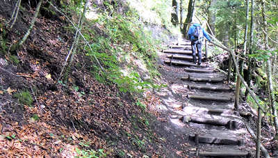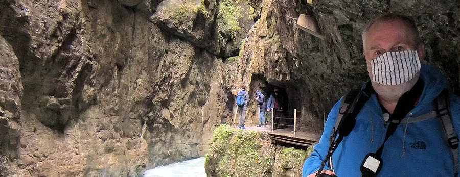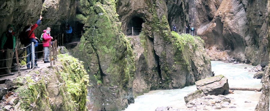 schon sehr freuen. Soll sie doch beeindruckende Bilder ermöglichen. Irgendwann ist Licht am Horizont auszumachen, soll heißen: Die Regenwolken ziehen sich etwas zurück und der Himmel beginnt, blaue Flecken zu bilden. ![]() Nach dem Frühstück geht es wieder runter zur Haltestelle und mit dem Bus bis zur Station Hammersbach. Wir orientieren uns noch etwas, wo es wohl losgehen könnte. Zum Glück kommen einige Wandersleut, so dass wir uns nicht auf die App "Komoot" verlassen müssen sondern nur dem von ihnen eingeschlagenen Weg folgen müssen. Es geht sehr steil bergauf und schon bald sehen wir von den Wanderern nichts mehr. Der Weg hat hohe Stufen. Sind wir etwa auf dem Bright Angel Trail im Grand Canyon? Das Problem ist, dass der Boden und auch die Stufen von dem vielen Regen völlig durchnässt und somit sehr rutschig sind. Unsere Smartphones sagen uns, dass wir mal besser auf Komoot gehört hätten statt den Wanderen zu folgen: Denn wir sind falsch. Nicht wirklich falsch, nur ist dieser Weg deutlich länger. Noch vier Kilometer sind es allein bis zum Eingang der Klamm und der Blick nach vorne geht immer nur hoch und höher. Wir setzen uns auf eine Bank und nach Luft schnappend entscheiden wir uns gegen die Tour, obwohl uns aufgrund der rutschigen Stufen auch vor dem Abstieg graut. ![]() Aber alles geht gut: Schritt für Schritt steigen wir ganz vorsichtig ab. Die Ironie ist, dass meine derzeitigen Wanderschuhe, die schon so manche Meile durch die amerikanischen Canyons gelaufen sind, ziemlich ausgelatscht sind und kaum noch Profil haben. Die neuen Schuhe stehen im Camper, weil die neuen noch etwas drücken. Unten an der Busstation warten wir auf den Bus in die Gegenrichtung und fahren nach einer Dreiviertel Stunde des Wartens nach Garmisch-Partenkirchen. Denn statt der Höllentalklamm planen wir jetzt die Partnachklamm zu durchlaufen. Sie soll kaum weniger spektakulär sein, aber wesentlich leichter zu erreichen und zu begehen sein. Am Bahnhof von Garmisch Partenkirchen steigen wir aus und statt in einen anderen Bus umzusteigen gehen wir die knapp 6 Kilometer zu Fuß. Der Weg führt uns an der Olympia-Sprungchance vorbei, die bereits bei der Olympiade 1936 im Mittelpunkt stand. Geplant ist, dass sie auch 2025 noch einmal in den Mittelpunkt rückt. ![]() Kurz vor dem Eingang kommen wir nicht umhin, Toiletten aufzusuchen und entscheiden uns gegen die öffentlichen Toiletten zugunsten der Räume im Klammhaus, einem netten Gasthaus, wo es freundliche Bedienung und heißen Kaffee gibt. Denn es ist wirklich etwas kalt. Am Eingang zur Klamm erfahren wir, dass der Weg durch die Klamm Corona-bedingt eine Einbahnstraße ist und der Rückweg über die Partnachalm führt. Wir haben keine Ahnung, was das bedeutet, aber da so viele Wanderer, egal welchen Alters, den Eintritt zahlen, kann es schon nicht so schlimm sein. Der reguläre Eintritt beträgt 6,00€/Person, der ermäßigte Preis, den wir durch unsere Touristenkarte erhalten, 5,00€. Kaum durch das Kassenhäuschen hindurch geht es in einen recht dunklen Tunnel ![]() und dann direkt rein in die Klamm. ![]() Wir wissen nicht einzuschätzen, wie lang der Weg immer wieder durch kleine Tunnel unterbrochen an der brausenden und tosenden Partnach entlang läuft. ![]() Erst später erfahren wir, dass es 702 Meter sind. ![]() Ich rate dringend, spritzwassergeschützte Kameras oder Smartphones mitzunehmen, denn das Wasser spritzt von unten von der Partnach immer wieder nach oben und von oben an den Wänden tropft es wieder runter. ![]() Es ist ein beeindruckendes Erlebnis. Mit den Schutzmasken vor dem Mund und das Brüllen der Partnach in den Ohren versteht man kein Wort von der Ehefrau, sogar wenn man es möchte :-) ![]() Der Weg ist sehr belebt und wir mögen uns gar nicht vorstellen, was auf diesem Stück an Wochenenden oder zur Hochsaison los ist, insbesondere, wenn der Weg außerhalb der Corona-Zeit in beide Richtungen begehbar ist. Die dunklen Passagen sollte man mit sehr viel Vorsicht durchlaufen, denn es gibt Stellen, die weniger als 1,75m hoch sind und teilweise sind die kleinen Tunnelpassagen so dunkel, dass man fast nichts sieht. Nach einiger Zeit und fast unendlich vielen Bildern verlassen wir die Klamm und gelangen zu dem breiten Oberlauf. Es ist trocken, hell, breit und...leise, denn die Partnach fließt gemächlich etwas weiter unten und sammelt sich, um sich anschließend in und durch die Klamm zu stürmen. ![]() Wir machen uns also auf den weiteren Weg über die Partnachalm. Angeblich warten 30 Minuten Gehweg auf uns. Wir wissen nicht, welche Steigung uns erwartet, noch wie lang der Weg ist. 30 Minuten Gehweg ist eine sehr individuelle Angabe. Und der weitere Weg hat es wirklich in sich. Es geht sehr steil bergauf und wir hecheln ganz schön. ![]() Unser GPS-Gerät zeigt eine Steigung von 290 Höhenmetern an als wir den höchsten Punkt erreichen. Subjektiv würden wir sagen: 290 Meter Steilwand. Endlich oben angekommen geht es wieder um 290 Tiefenmeter nach unten. Und die sind fast schwieriger als der Aufstieg, denn auch hier ist es sehr rutschig und wir sind nicht die einzigen, die wie auf rohen Eiern absteigen. 30 Minuten Gehweg stimmt absolut nicht, auch für Wanderer mit besserer Kondition ist das kaum zu schaffen. Ich finde es unverantwortlich, dass reinkommende Wanderer nicht darauf hingewiesen werden, was sie bei einem "One-Way-Trip" alles erwartet. Recht platt erreichen wir nach etwa 3 Stunden insgesamt wieder den Eingang zur Klamm. Von hieraus gehen wir wieder die knapp sechs Kilometer bis zur Busstation. Im Basiscamp angekommen relaxen wir und steuern gegen 18 Uhr unser Restaurant an. Diesmal sind wir früh genug hier und finden noch einen Platz drinnen. Heute ist Burger-Tag und das läuft richtig nett ab: Burger und Patties werden auf dem Grill fertig gemacht und anschließend geht´s an die Theke und man sagt, wie man sie belegt haben möchte. Die Bedienung ist -und das müssen wir hier betonen - so etwas von nett, lu