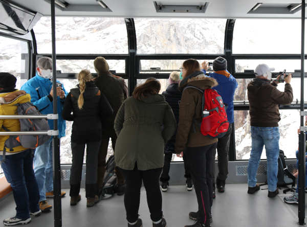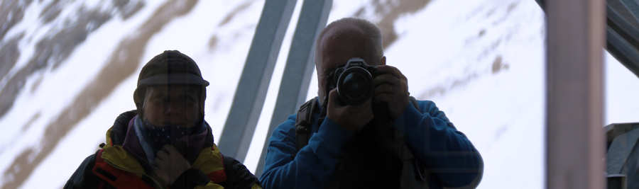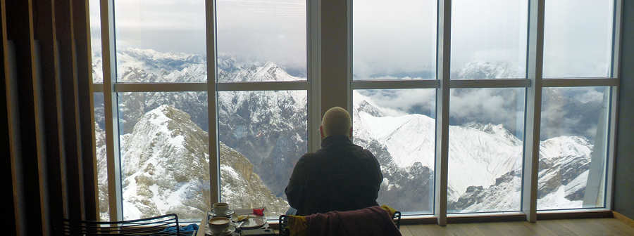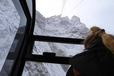 diesen Temperaturen und Schnee unmöglich, oder?![]() Es gibt Menschen, die das aber auch jetzt schaffen. Um uns aufzuwärmen nehmen wir in der Cafe-Bar des Gipfelrestaurants "Panorama 2962" einen heißen Kaffee zu uns und stellen fest, dass der Blick auch weiterhin atemberaubend ist, jetzt aber deutlich wärmer und gemütlicher. Es geht wieder nach unten, aber wie? Wir haben vorhin an der Talstation die "Zugspitze Rundreise" zum Preis von derzeit 59,00 €/Person gekauft. Bei der Planung haben uns Freunde und Bekannte darauf aufmerksam gemacht, dass es allgemein heißt, dass die Fahrt auf die Zugspitze die teuerste Gondelfahrt Deutschlands ist. Aber schließlich ist es nun mal der höchste Berg Deutschlands und es ist eine Rundreise mit zwei Möglichkeiten ins Tal zu kommen: a) Wir fahren mit der gleichen Bahn wieder runter. b) Oder wir bedienen uns der Gletscherbahn und Zahnradbahn und hierfür entscheiden wir uns. Die Gletscherbahn ist auch eine Gondelbahn, deren Gondeln jedoch kleiner als bei der Zugspitzbahn sind. ![]() Sie führt uns innerhalb von nur 4 Minuten von 2962 Metern auf 2602 Meter runter. Hier wechseln wir in die Bayerische Zugspitzbahn, eine Zahnradbahn, ![]() die uns vom Zugspitzplatt rund 1400 Meter tiefer zur Talstation bringt. Rund 19 km ist die Strecke lang und der geenterte Fensterplatz erweist sich als weniger wichtig als gedacht, denn die 45 minütige Fahrt führt gefühlt 44 Minuten durch den Tunnel. Nett sind die Ablagen über der Bestuhlung. Sie sind ungewöhnlich klein und machen ihrem Namen Hutablage alle Ehre. ![]() ![]() |
