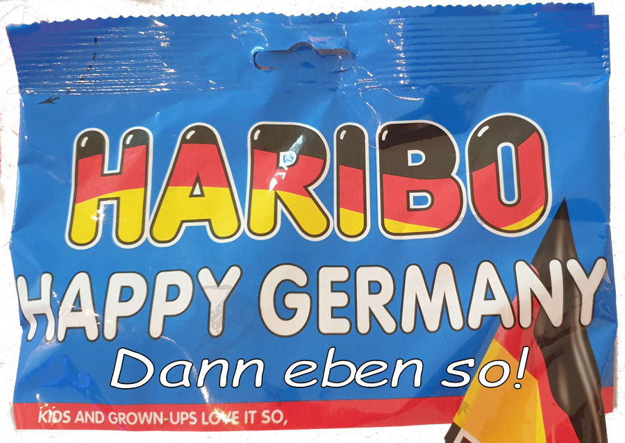 *Wie kommen wir zu diesem Titel? Zunächst muss erklärt werden, dass der Entschluss, mit dem Wohnmobil durch Deutschland zu fahren, der derzeitigen Situation geschuldet war und sich für unsere Verhältnisse recht spontan ergab. Der Untertitel "Dann eben so!" stand schon länger fest. Zwei oder drei Wochen vor Beginn der Tour machten wir in unserer Nähe eine Wanderung und stießen als Ausgangspunkt eines Hikes in Bad Godesberg auf den Fabrikverkauf von Haribo. Die Tüte "Happy Germany" hat es uns angetan und somit stand der Titel fest. |