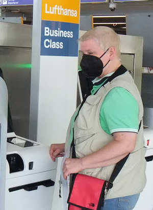 weil etwas mit den Impfnachweisen nicht stimmt. Demzufolge gehen wir zum Lufthansa-Service, doch hier bedient uns ein freundlicher und sicherlich bemühter, aber offensichtlich überforderter Mitarbeiter. Er spielt mit meinem Smartphone, scheint aber zunächst das Problem und im weiteren Verlauf auch die App auf dem Handy nicht zu verstehen. Dafür versucht er uns zu beruhigen und geht davon aus, dass mit unseren Bordkarten alles in Ordnung sei. Ungeachtet dieser netten aber nicht durch Kompetenz untermauerten Meinung gehen wir direkt zu einem der für uns zuständigen Schaltern und tragen unser Problem erneut vor. Diese Mitarbeiterin erfasst unser Problem zügig, kontrolliert im