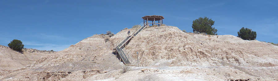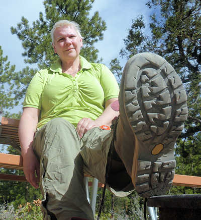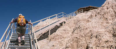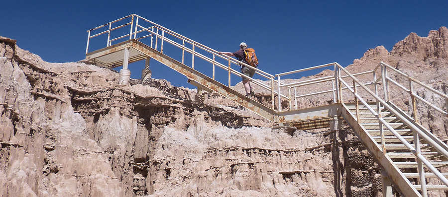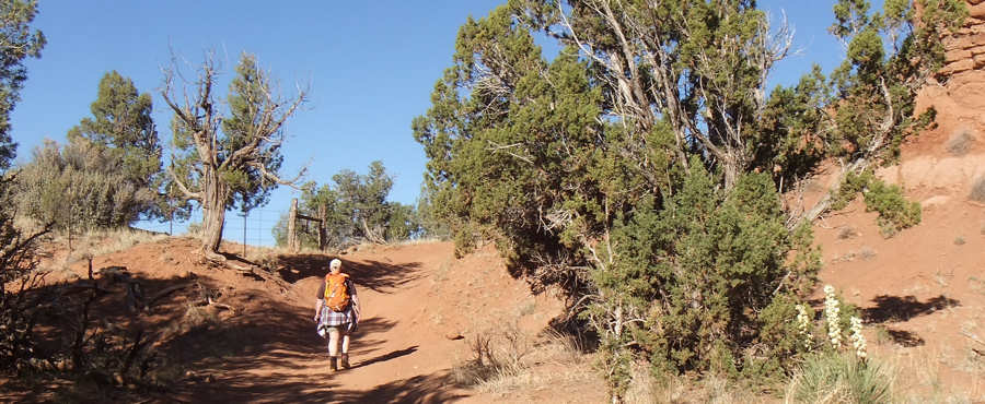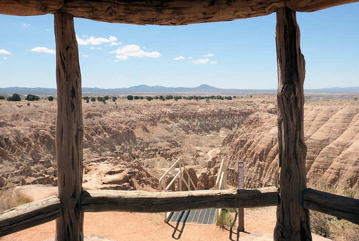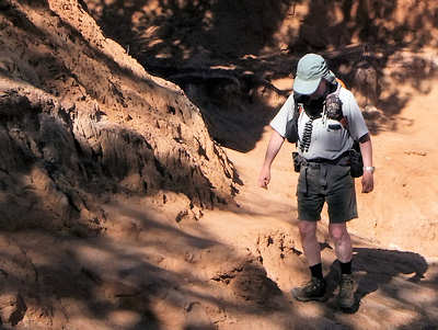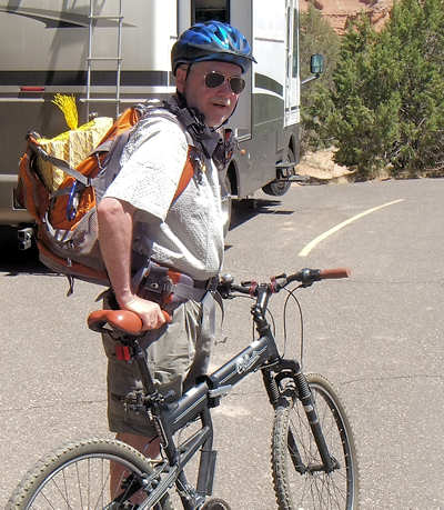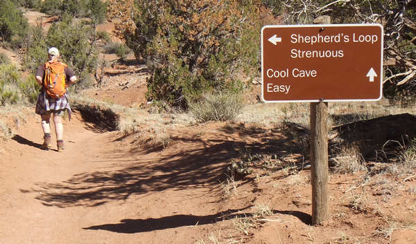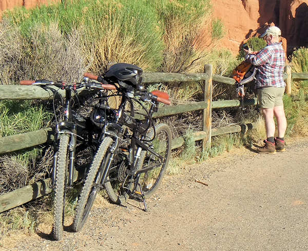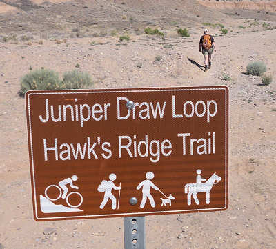 schon zu Fuß und mit dem Rad erkundet haben. Doch unser Campsite-Nachbar kommt auf uns zu und bittet uns, ihm zu helfen. Er fährt eins der Gespanne, die bei den hiesigen Campern sehr beliebt sind und die ich bei uns in der Heimat noch nie gesehen habe. Hinter seinem Wohnmobil zieht er einen "normalen" PKW hinter sich her und ich frage mich schon seit Jahren, was an dem PKW modifiziert werden muss, damit das ganze funktioniert. Der Nachbar möchte kontrollieren, ob die Bremsleuchten des PKW funktionieren und das kann man eben nicht, wenn man allein ist. Sofort erkläre ich mich bereit, ihm zu helfen und nutze die Situation schamlos aus, indem ich ihn diesbezüglich ausfrage. Er kann sich gar nicht vorstellen, dass es solche Gespanne bei uns nicht gibt und scheint eine Freude daran zu haben, meine Fragen zu beantworten. Ich fasse in Stichworten mal zusammen: Bremsen: Das Wohnmobil hat eine Druckluftbremsanlage und im PKW ist eine Box verbaut, die darauf aufbaut. Bremst die Zugmaschine, dann wird das Bremspedal des PKW über Druckluft betätigt. Gleichzeitig hat das Gespann auch eine Auflaufbremse, die im Prinzip genauso arbeitet. Reißt der PKW ab, so wird es auch einen Druckluftschlauch zerreißen, der wiederum ein Bremsen im PKW aktiviert. Außerdem gibt es noch eine elektrische Verbindung, die ebenfalls abreißen würde, und dem Fahrer sofort eine Warnmeldung gibt. Daran kann ich mich noch ganz vage erinnern, als ich damals den LKW-Führerschein gemacht habe. Getriebe: Hier habe ich an seinen Ausführungen leider etwas nicht ganz verstanden. Das Automatikgetriebe des PKW muss auf "N" gestellt werden, was mir einleuchtet. Allerdings hieß es früher, dass Automatikfahrzeuge nur über kurze Distanzen geschleppt werden dürfen, weil der Ölkreislauf im Getriebe stoppt. Und dann soll die Automatik auf "P" gestellt werden, was ich nun noch weniger verstehen kann, da "P" meines Erachtens den ganzen Antriebsstrang sperrt. Also hier fische ich noch im Trüben. Lenkung: Und das hat mich besonders überrascht: Ich bin immer davon ausgegangen, dass das Zugfahrzeug -wie auch immer- mechanisch auf die Lenkung eingreift aber hier gibt es gar keine Verbindung. Der Schlüssel muss eingesteckt sein, so dass die Lenkradsperre nicht greift und der PKW läuft aufgrund des Vorlaufs der Vorderachse ganz brav hinterher. Also für mich hat sich diese kleine Lehrstunde wirklich gelohnt und (fast) alle Fragen geklärt. Aber jetzt zurück zu unserem Trail: In unseren Erinnerungen und auch auf dem Parkplan startet die Juniper Draw Loop und Hawk Ridge Trail gemeinsam und irgendwann geht der zweitgenannte dann vom erstgenannten Trail ab. Wir sind guter Dinge, den Abzweiger morgen zu finden, zumal wir uns erinnern, dass man den Hawk Ridge Trail in der Ferne ganz gut identifizieren kann. Aber heute geht es ja um die Juniper Draw Loop. Und die Länge des Trails? Die einen sagen so, die anderen so. An der einen Stelle ist von 3 Meilen die Rede, an anderer von vier. Aber egal, die Differenz stellt kein Problem dar. ![]() Das Schild am Trailhead ist (für uns) neu, denn damals war nur auf der grobgezeichneten Karte zu entnehmen, dass beide Trails das erste Stück gemeinsam laufen. Der Trail ist in keinster Weise anspruchsvoll, denn er hat so gut wie keine Steigung und ist hervorragend ausgeschildert, in dem alle paar Meter kleine Pfosten der Weg eindeutig markieren. Die Landschaft ist karg, skurril und unwirklich und ich denke mir, hier hätte man in den 60ern mit Sicherheit sehr gut eine Folge von Raumschiff Enterprise drehen können: Kirk auf dem Planeten "Kathe-Dral". ![]() Und er ist bis zu einem bestimmten Abschnitt sehr einsam, damals wie heute. Im ersten Abschnitt begleitet uns kurz eine Wanderin, die dann aber an einem Schild abzweigt und das ist besonders interessant. ![]() Denn damals gab es dieses Schild noch nicht und auch den mittlerweile angelegten Trail suchten wir zunächst vergebens, bis wir in der Ferne dann den Trail zum Hawk´s Ridge Trail doch noch entdeckten. Übrigens waren wir damals nicht die einzigen, die etwas verwirrt waren und dn Trail suchten. Auf dem Trail passieren wir eine Vielzahl von skurrilen Felsformationen aus sehr weichen Sandstein. Er zerbröckelt leicht in der Hand und lässt erahnen, dass sich die Landschaft spätestens beim nächsten starken Regen schon wieder etwas verändern wird. Viele Regen weiter, so vermuten wir, und das Tal, das wir gerade durchqueren, wird nur noch flach sein. ![]() Obwohl der Trail fast völlig eben verläuft und somit kaum anspruchsvoll ist, ist es die Sonne, die den Hike doch etwas anstrengend macht. Etwa 33Grad sollen es heute sein, aber die Sonne kennt kein Erbarmen mit uns. Anita ist gesundheitlich immer noch nicht 100% in Ordnung und leidet ziemlich, lässt es sich aber nicht ausreden, den Abzweiger zu Miller Point zu nehmen. Mir ist wohlbewusst, dass sie den Weg wegen mir einschlägt, weil ich gerne ein paar Fotos machen möchte. Meine Argumente, sie abzuhalten, verdunsten bei ihr wie ein Tropfen Wasser in der sengenden Hitze. Ein kurzes Stück durch einen kleinen Canyon und wir sehen nicht nur ein paar Touristen, die uns entgegenkommen, sondern auch das, was vor bzw. über uns liegt. ![]() Wir klettern stetig die steilen Leitern hoch und tauschen unsere Rollen. Anita, die eben noch ziemlich nach Luft schnappte, läuft nun ohne nennenswerte Unterbrechung wir eine Geis die Stufen hoch und ich hingegen, der eben noch locker über den Trail schlenderte, japse jetzt nach Luft und nutze jede Möglichkeit Pause zu machen, ich meine natürlich Fotos zu machen. ![]() ![]() Oben am Miller Point angekommen hängen wir aber beide in den Seilen und nach wenigen Minuten weckt uns ein ziemlich lautes Schnaufen aus der Rekonvaleszenz. Ein Hiker-Pärchen, geschätzt etwas jünger als wir, kommt hinauf und die roten Köpfe zeigen uns: Muss wohl anstrengend sein. ![]() Der Blick von hier oben hinunter auf die Ebene entschädigt uns für den etwas anstrendenen Auf