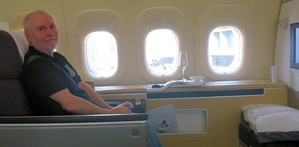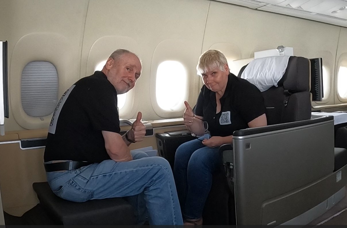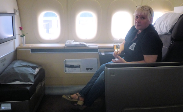 ![]() Sogleich wird uns ein Begrüßungsgetränk gereicht, wobei mir der Fehler passiert, den Flugbegleiter falsch zu verstehen. Statt "Sparkling Wine" verstehe ich "Sparkling Water" und so erhalte ich statt des gewünschten Sprudelwassers zur Freude von Anita ein Glas Sekt, das ich natürlich gerne an sie weiterreiche. ![]() Es wird einer der amüsantesten Flüge, die wir je erlebt haben: