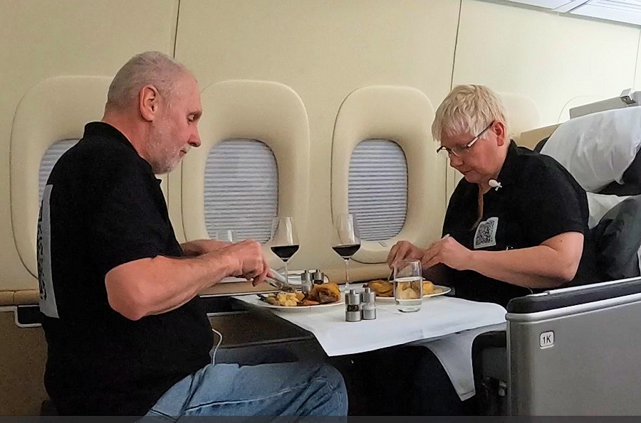 Rund 20 Minuten benötigen wir für den Weg und zielstrebig steuern wir die Lounge der Staralliance an. Die nette Dame gewährt uns Einlass zur Business-Lounge nachdem sie unsere Bordkarten gescannt hat, wobei Anita diejenige von uns ist, die den Fehler bemerkt und nachhakt, ob wir denn nicht in die First Class Lounge dürfen. Die freundliche Mitarbeiterin kontrolliert erneut, entschuldigt sich mehrmals und lässt uns hinein. Vermutlich sehen wir halt nicht so aus, als würden wir dort hingehören. :-) ![]() Wie im letzten Jahr sind wir zunächst allein und sogleich kommt ein Mitarbeiter und reicht uns die Speisekarte. Im Gegensatz zum vergangenen Jahr ist der Empfang heute nicht ganz so freundlich und humorvoll. Auch der Hinweis fehlt, dass wir auch jederzeit zur Business-Lounge durchgehen könnten, wenn wir auf etwas Appetit haben, was es hier am Buffett nicht gibt. Auch die anderen Mitarbeiter tun, was sie tun müssen aber Freude an der Arbeit sieht anders aus. Aber das ist nur eine Momentaufnahme. Langsam füllt sich die Lounge mit weiteren drei oder vier Reisenden. Per Pushnachricht und Durchsage werden wir informiert, dass unser Flug ca. 25 Minuten Verspätung hat. Irgendwann gehen wir dann zum nahegelegenen Gate, wo es nach einem kleinen Chaos aussieht. Mitarbeiter laufen mit Schildern mit Zahlen herum, die für die Boarding-Gruppen gedacht sind. Hier in den USA wird oft statt nach Reihen in Gruppen geboardet und wie wir gelesen haben will Lufthansa das zukünftig grundsätzlich auch einführen. Wir erkundigen uns, wo wir uns anstellen sollen, werden zunächst ganz nach vorne in die erste Reihe gerufen, um kurz danach an den Schalter verwiesen zu werden, weil unsere Boardkarten gegen andere ausgetauscht werden. Wir fragen uns, weshalb wir erst Karten ausdrucken lassen sollen, wenn wir dann doch andere bekommen. Das Boarding beginnt aber wir müssen noch paar Minuten am Eingang des Fingers verharren, weil die Maschine wohl doch noch nicht ganz fertig vorbereitet ist. Endlich kommt eine Flugbegleiterin aus dem Flugzeug um uns abzuholen. Der Empfang in der 747-8 "Schleswig-Holstein" ist freundlich, die Purserin erkundigt sich ausgiebig nach den QR-Codes auf unseren Shirts und wir unterhalten uns eine ganze Weile über die Lufthansa, die 747-8, die sie ehrfürchtig die "Königin der Lüfte" nennt und auch über den A380, für den sie leider keine Lizenz hat. Wir haben wieder die beiden Plätze in der ersten Reihe, was auch der Grund ist, weshalb wir erst heute fliegen. Eigentlich planten wir ursprünglich, gestern bereits zurückzukehren aber auf diesem Flug waren unsere favorisierten Plätze bereits belegt. Sofort wird ein Glas Champagner gereicht. Der für uns zuständige Flugbegleiter stellt sich vor und bald schon starten wir. Die Verspätung erklärt uns der Pilot folgendermaßen: Die Maschine kam pünktlich aus Frankfurt, aber der vorgesehene Parkplatz war noch besetzt. Die Parkzeit wurde, um die Verspätung gering zu halten, auf das seitens der Sicherheit vorgeschriebene Minimalmaß reduziert und außerdem verspricht er, etwas schneller zu fliegen. Zu dem Flug werden wir vermutlich wieder einen YouTube-Clip erstellen, so dass wir uns an dieser Stelle kurz halten können. Der Service ist zuvorkommend und freundlich, das Essen hervorragend, die Speisenauswahl groß und der Flug recht ruhig. Die Flugbeleiter haben wieder nichts dagegen, dass Anita und ich uns zum Essen zusammensetzen. Anita verzichtet wieder auf ihren Kaviar und tritt ihn an mich ab. Unser Flugbegleiter meint es wohl sehr gut mit mir und serviert eine besonders große Portion. ![]() Nach ca. 3 Stunden sind wir mit dem Speisen durch und legen uns in die frisch bezogenen Betten. Die Flugbegleiterin fragt uns noch, ob wir zum Frühstück geweckt werden wollen, was wir großmundig verneinen, da wir eher wenig schlafen und stets von selbst aufwachen. Wir legen uns also in die aufgebetteten Sessel und mein Blick fällt auf die für die First Class der Lufthansa obligatorische frische Rose, die ja auf dem Hinflug an meinem Platz fehlte. Ich habe das übrigens nicht reklamiert :-) Im ernst: Vielen Gästen ist diese Rose sehr wichtig und es gibt im Netz einige Clips, bei denen das Fehlen der Rose während der Corona-Phase zutiefst bedauert und ihre Rückkehr gefeiert wurde. Ich finde sie dekorativ aber nicht wirklich wichtig. Es ist schon etwas verrückt, denn alle Rosen an den acht First-Class-Plätzen werden durch kleine Spots angeleuchtet. ![]() Als ich erwache traue ich meinen Augen bzw. der Uhr kaum: Ich habe gut sechs Stunden geschlafen, so lange wie noch nie. ![]() Wir frühstücken gemeinsam und während ich mich im Bad umziehe und frischmache bauen die Flugbegleiter die Betten wieder zum normalen Sitz um und da hören wir plötzlich, dass der Pilot mitteilt, dass wir in den Landeanflug gehen. Wir haben die Zeit offensichtlich total aus den Augen verloren. Anita gerät in Panik, ist sie doch noch im Schlafanzug und die beiden Waschräume von den anderen Gästen, die ebenfalls verschlafen haben, besetzt. Also muss sie sich mitten in der Kabine umziehen und hier bewähren sich erneut unsere beiden Sitzplätze 1A und 1K. Mit hochgefahrener Trennwand kann sie sich von Blicken ungestört bequem aber dennoch recht hastig umziehen. Wer den Rückflug einmal in der Zusammenfassung auf YouTube sehen möchte, der sollte hier anklicken: ![]() bitte anklicken Wir landen pünktlich, bedanken uns herzlich bei der Crew für den angenehmen Flug und den aufmerksamen Service und machen uns auf den Weg zur Welcome-Lounge der Lufthansa, die wir diesmal auch sofort finden. Die Lounge hat uns ja letzten Jahr nicht so zugesagt, doch diesmal sind wir rundherum zufrieden. Das Buffett ist im Gegensatz zum Vorjahr noch gut gefüllt obwohl die Lounge in 45 Minuten schließen wird und die Mitarbeiter sind aufmerksam und freundlich. Was uns diesmal gut gefällt sind auch die sanitären Einrichtungen, die sehr sauber und ansprechend sind. Es gibt